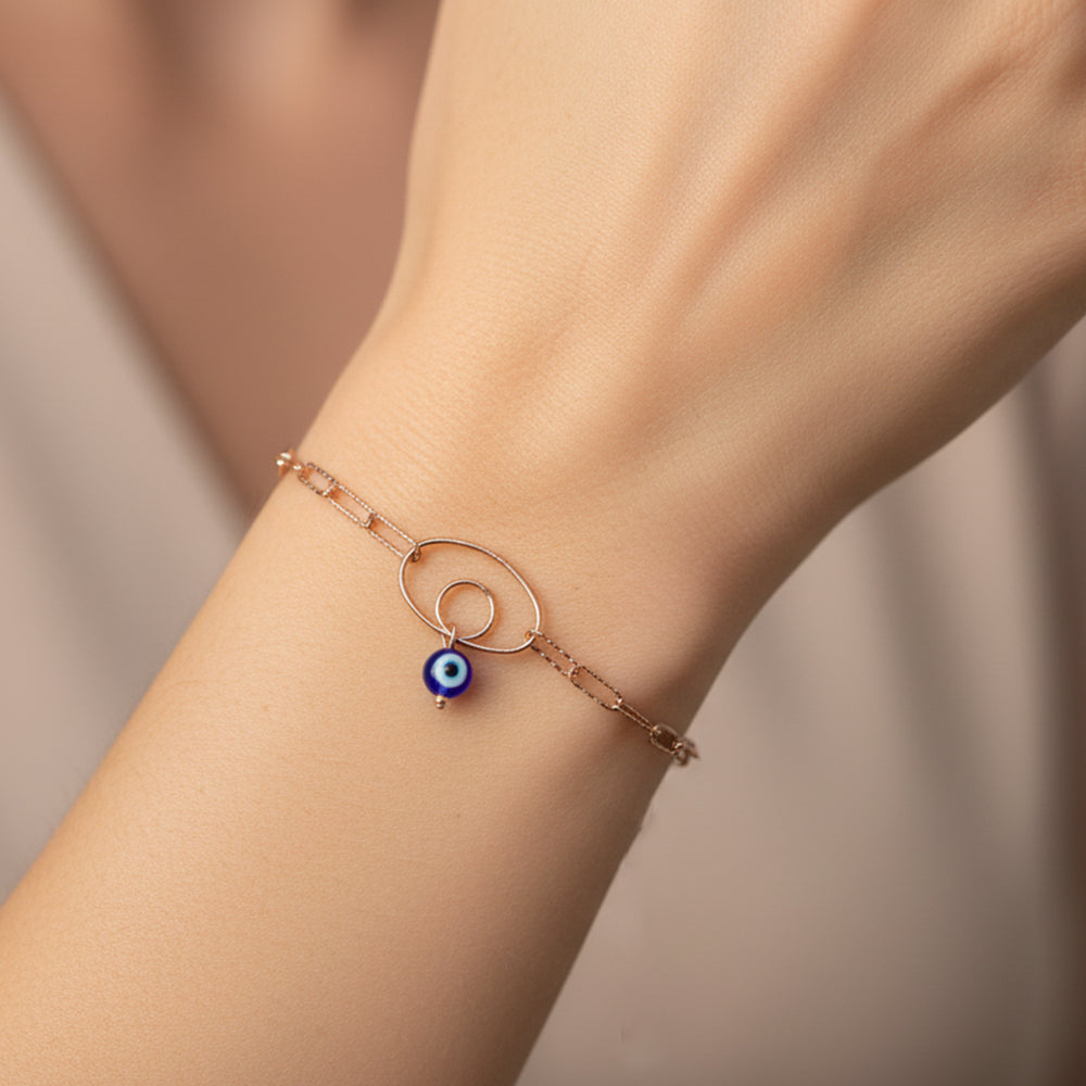 Protect your vibe with this fashionable link bracelet! Featuring a trendy rose gold chain with a subtle texture and a sleek, double-ring focal point.
