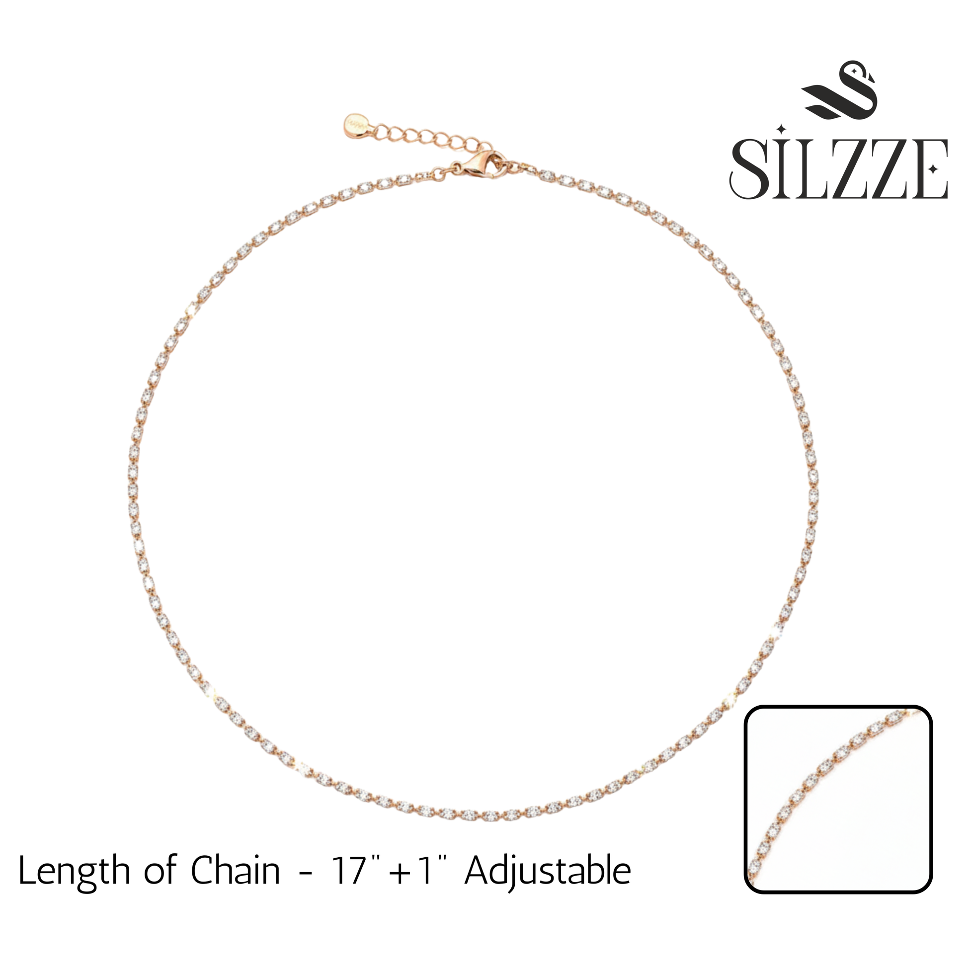This exquisite piece captures the classic luxury of a diamond tennis chain but is designed with a modern, delicate touch. Plated in stunning rose gold, catching the light with breathtaking brilliance. Perfect for both everyday wear and special occasions, this chain is an essential piece for any jewelry collection. Its adjustable chain ensures a comfortable, perfect fit, making it ideal for layering with other necklaces or wearing solo for a captivating, minimalist statement.