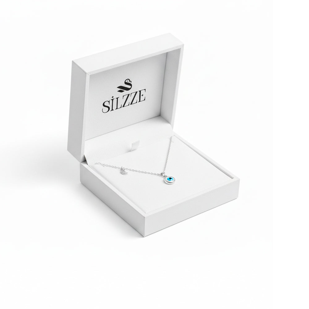 Protective Evil Eye necklace with a delicate Crescent Moon charm on a sterling silver chain.