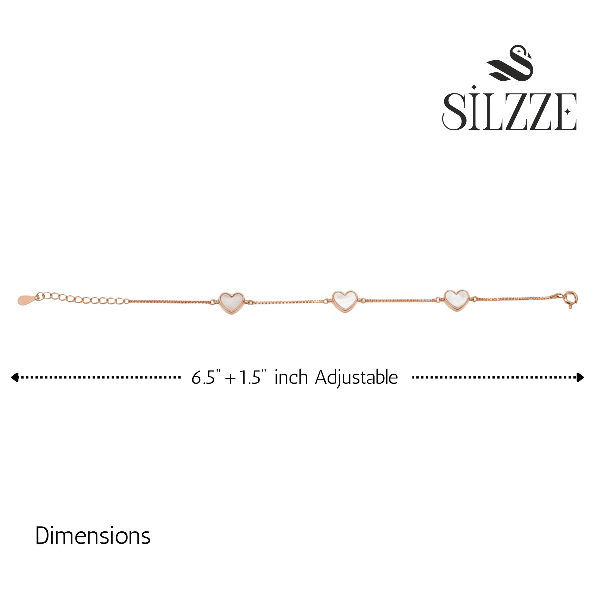 Experience eternal romance with this exquisite bracelet, finely crafted from 925 Sterling Silver and finished with a luxurious rose gold plating. The delicate chain is adorned with three heart charms inlaid with iridescent Mother of Pearl, embodying timeless elegance. The gentle rose gold hue and smooth Mother of Pearl hearts lend a soft, feminine touch, making it an ideal accessory for everyday wear or festive occasions. It serves as a sophisticated statement of affection, perfect for adding delicate glamour to both Western and traditional Indian outfits.