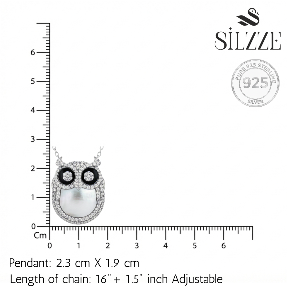 This adorable and sophisticated necklace features a wise Owl pendant crafted from genuine 925 Sterling Silver, centered with a luminous Mother of Pearl body. The design is brilliantly framed by sparkling pave cubic zirconia (CZ) and accented with glossy black enamel details for the eyes. This statement piece adds an element of whimsical luxury to any outfit, drawing the eye and instantly becoming a conversation starter. It will sit elegantly on the chest, symbolizing wisdom and protection for the wearer and giving a unique look.