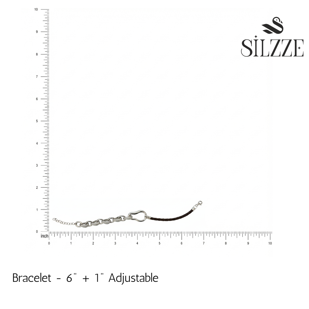 This bold, contemporary piece with high-polished 925 Sterling Silver heavy links, some featuring dazzling pave-set (CZ) stones, with a sturdy braided leather band. The bracelet is defined by its striking dual-material design, bridging industrial metal strength with organic leather texture for a fashion-forward look. The mix of bright silver and dark leather provides a rich, contrasting texture that pairs exceptionally well with watches and other metal bangles. This bracelet makes a strong, confident statement on the wrist, offering an ideal blend of rugged charm and glamorous sparkle that instantly elevates casual and semi-formal wear.