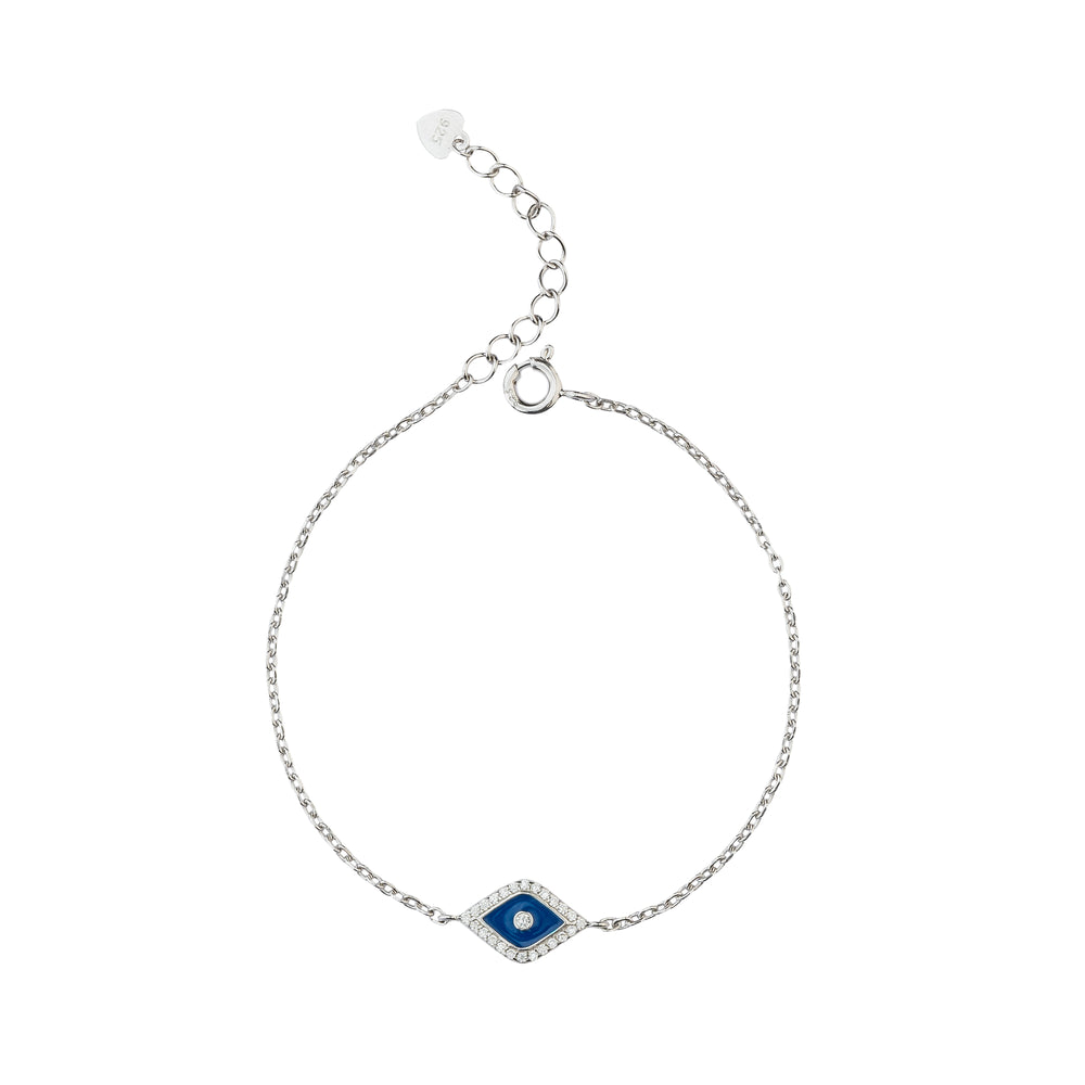 The delicate chain is designed for a lightweight, comfortable fit, making it an ideal accessory for everyday wear so just embrace the perfect blend of protection and elegance with this exquisite Evil Eye bracelet featuring a stunning marquise-shaped charm with a deep blue enamel center and a sparkling crystalline border. This piece serves as both a timeless fashion statement and a meaningful talisman.