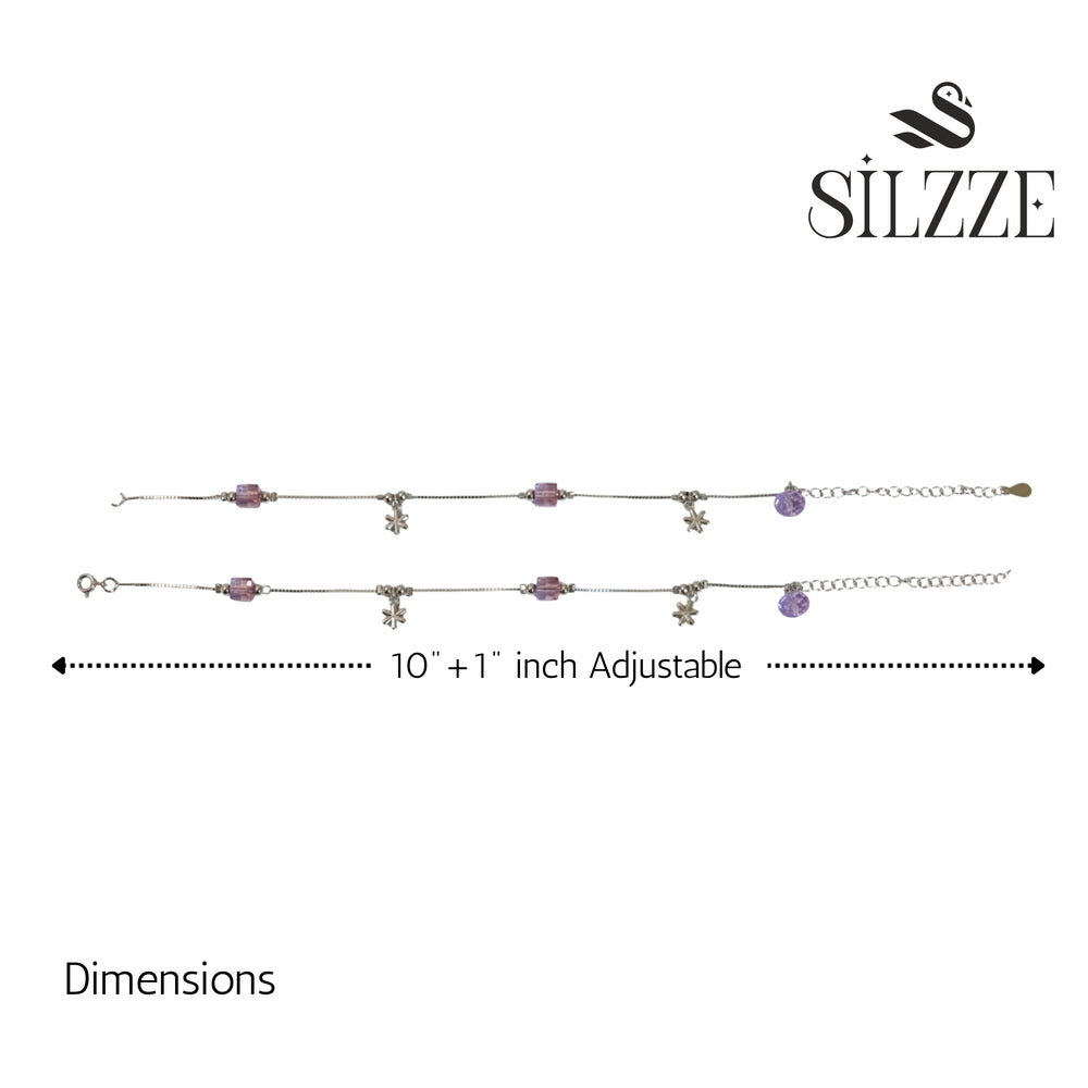 The delicate chain is adorned with small, dazzling amethyst-colored cubic beads interspersed with sweet, polished snowflake charms. The gentle purple hue of the stones adds a touch of sophistication and color, making it an exquisite accessory for any occasion or gifting to your someone special.