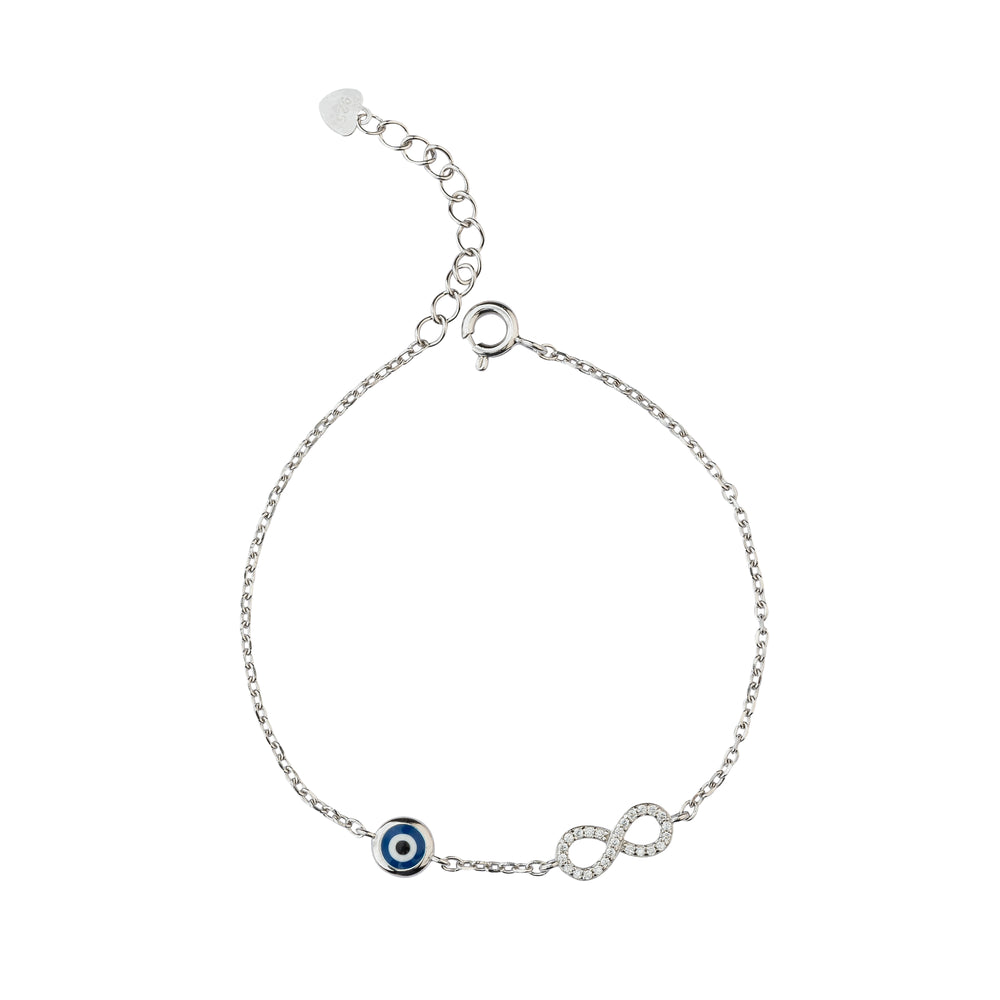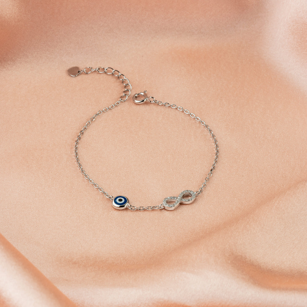 Celebrate everlasting harmony and style with this unique Infinite Protection bracelet. Crafted in 925 sterling silver, ensuring a brilliant, mirror-like polish and long-lasting durability. This elegant piece combines two powerful symbol it is a vibrant blue Evil Eye charm for protection and a shimmering, stone-studded infinity loop representing eternal connection. The minimalist design and fine link chain make it a perfect everyday accessory that carries a deep, soulful meaning.