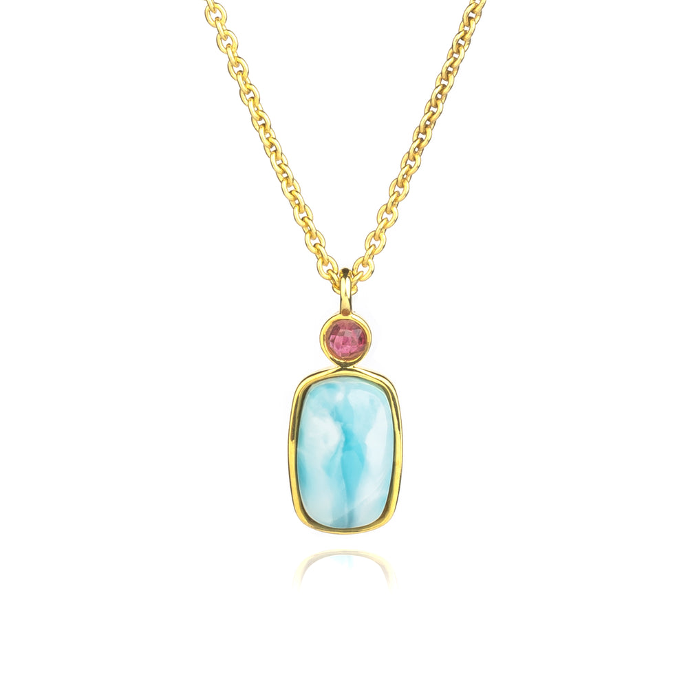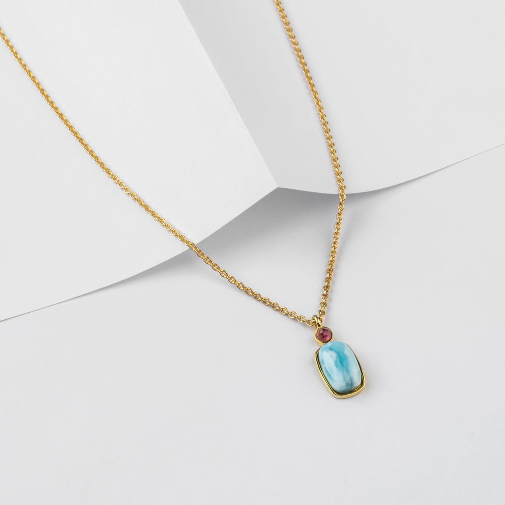 Discover the captivating beauty of the ocean captured in a sophisticated geometric design. Made with Pure 925 silver Wearing genuine Larimar is often associated with inner peace and soothing energy, while natural Tourmaline is known for promoting a sense of joy and emotional strength.This necklace features a stunning rectangular-cut natural Larimar stone, famous for its rare sky-blue patterns that evoke the serenity of tropical seas. Resting just above is a dainty, round-cut natural pink Tourmaline, creating a harmonious contrast of colors. Both genuine gemstones are encased in a clean, minimalist bezel that highlights their natural brilliance and unique character.