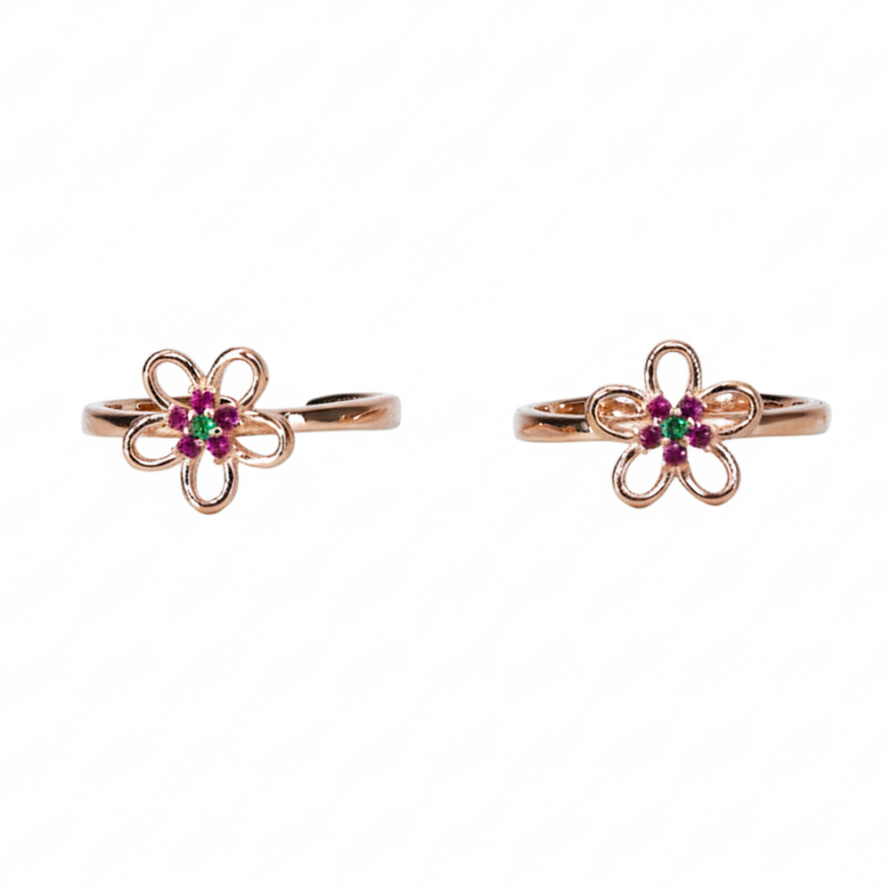 Crafted in a radiant rose gold finish, these adjustable rings feature a charming open-work flower design centered with tiny, glittering fuchsia and emerald-colored stones. Perfect for daily use
