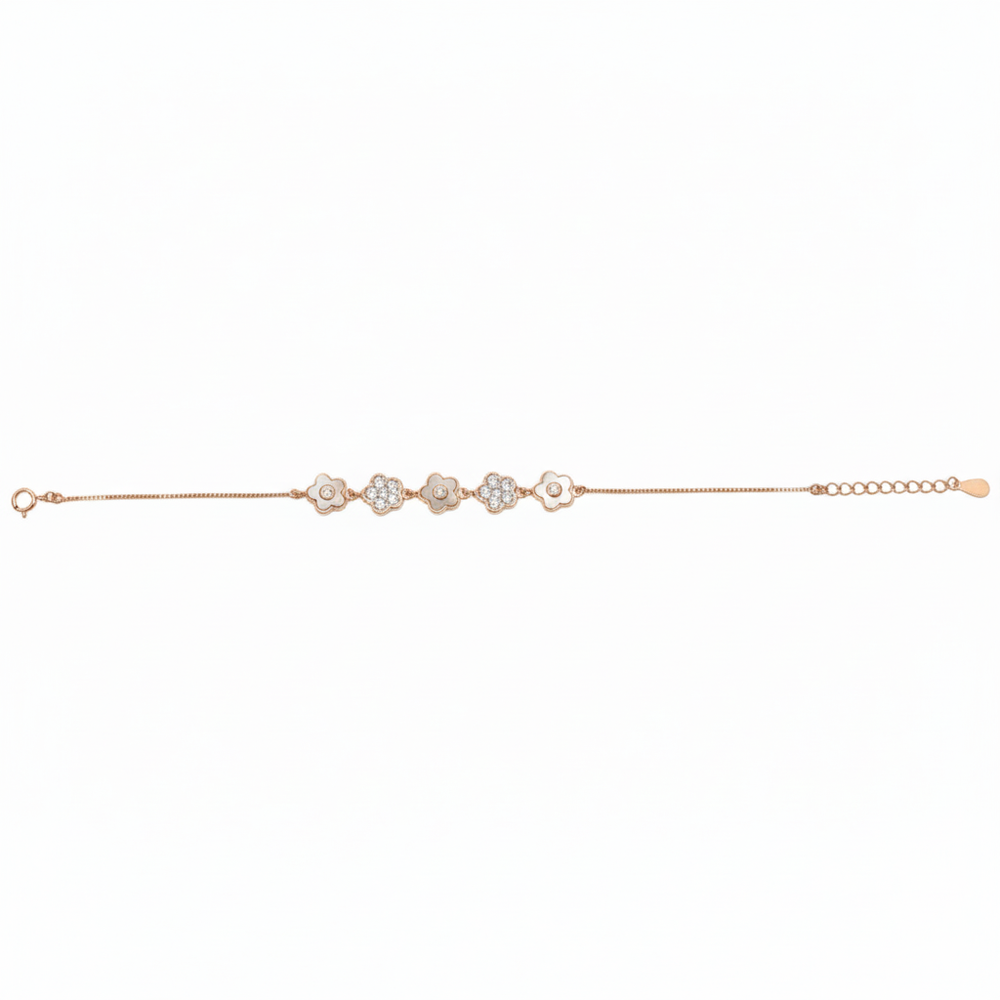 Crafted from genuine 925 Sterling Silver, this delicate bracelet features five charming floral motifs, alternating between luminous Mother of Pearl and dazzling Cubic Zirconia (CZ) diamonds. Its lightweight design allows for comfortable, all-day wear and layers beautifully with watches or other delicate silver jewellery, catching the light and drawing admiring glances.The gentle rose gold hue and smooth Mother of Pearl hearts lend a soft, feminine touch, making it an ideal accessory for everyday wear or festive occasions. It serves as a sophisticated statement of affection, perfect for adding delicate glamour to both Western and traditional Indian outfits.
