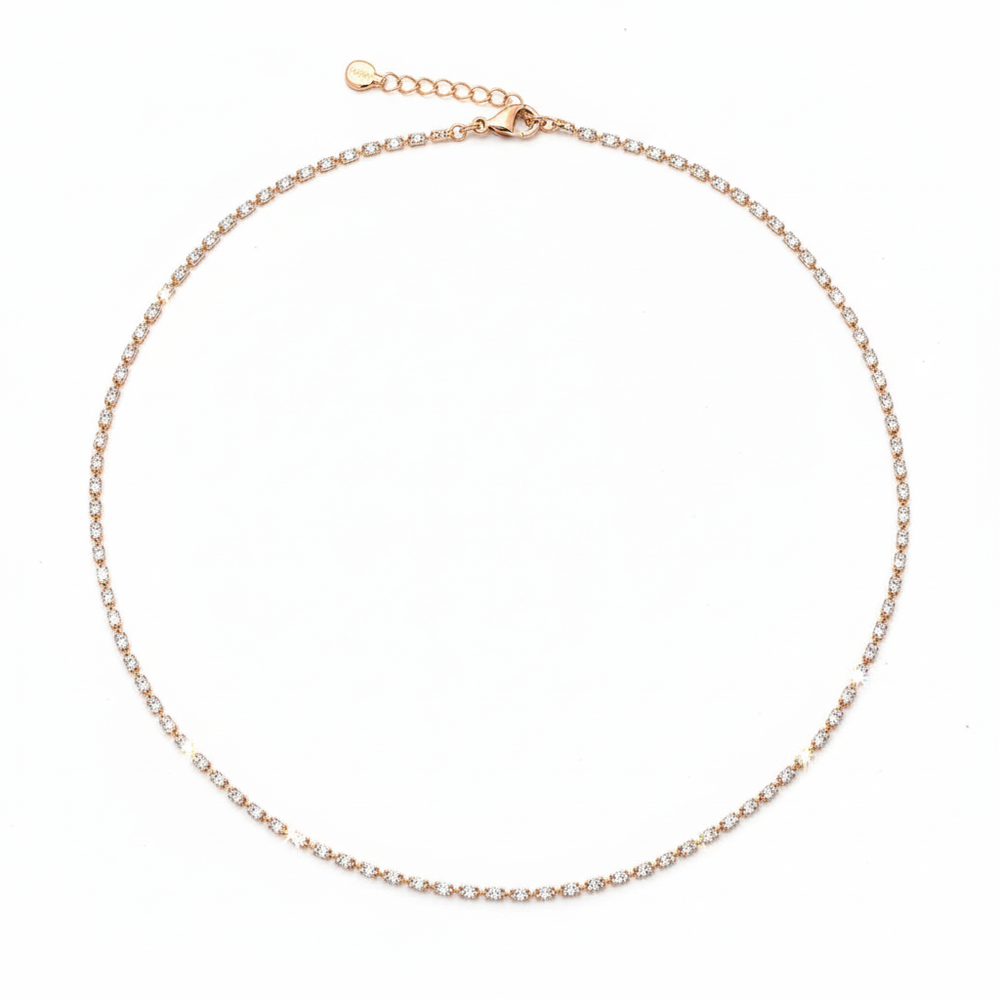 This exquisite piece captures the classic luxury of a diamond tennis chain but is designed with a modern, delicate touch. Plated in stunning rose gold, catching the light with breathtaking brilliance. Perfect for both everyday wear and special occasions, this chain is an essential piece for any jewelry collection. Its adjustable chain ensures a comfortable, perfect fit, making it ideal for layering with other necklaces or wearing solo for a captivating, minimalist statement.