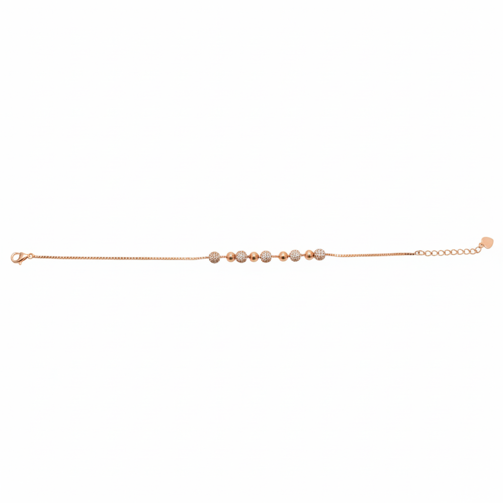 Crafted from genuine 925 Sterling Silver and finished with a luxurious rose gold polish , it features a delicate Venetian box chain adorned with alternating smooth polished beads and dazzling cubic zirconia-paved sphere beads. A subtle heart-shaped charm near the adjustable lock adds a touch of romantic detail, making it perfect for everyday wear or a special occasion.
