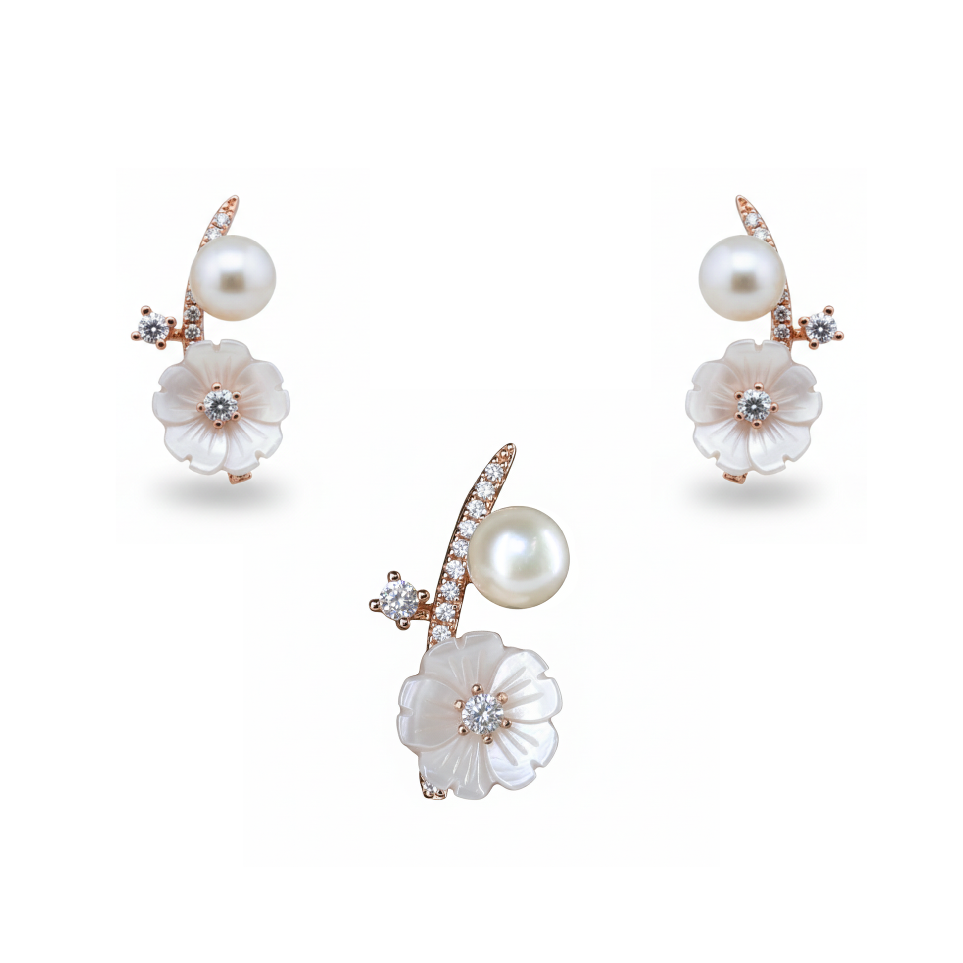 Capture the essence of spring with this exquisite floral jewelry set. Each piece features a delicate carved flower centered with a brilliant stone, paired with a shimmering pearl and sparkling accents. Crafted in 925 Sterling Silver, this timeless design brings a touch of sophisticated nature to any ensemble.