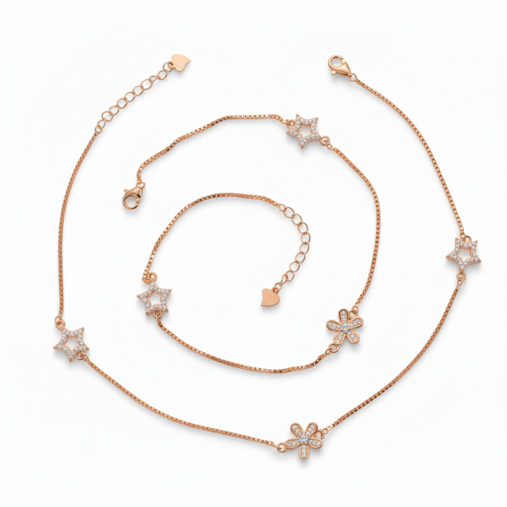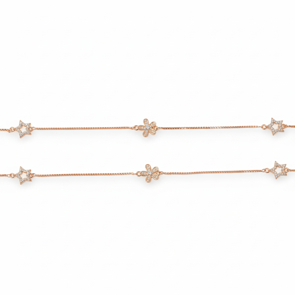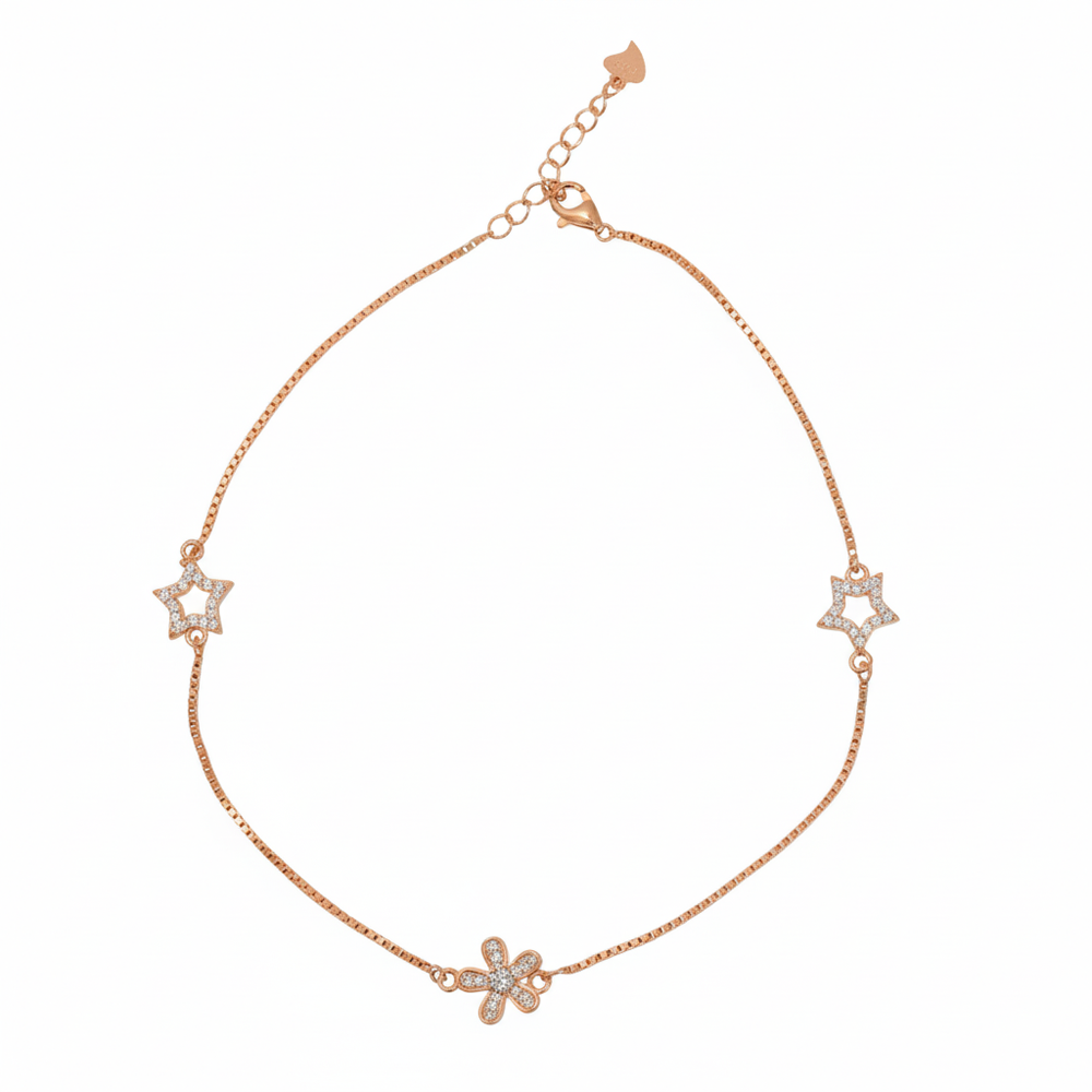 Crafted from 925 Sterling Silver and richly plated in warm rose gold. This stunning anklet features a delicate, sleek box chain that suspends two charming star and one flower motifs. The warm rose gold hue will beautifully complement every skin tone, giving the ankle a delicate, sun-kissed radiance and a soft, feminine glow. Perfect for everyday wear.