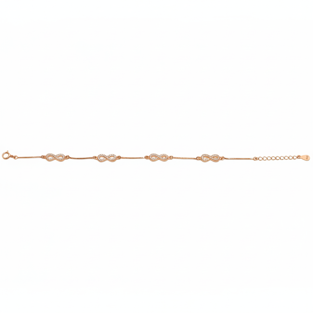 Our Rose Gold-Plated 925 Silver Multiple Infinity Link Bracelet weaves a captivating chain of enduring love and luxury. This striking design features four interconnected infinity symbols, each dazzlingly paved with brilliant cubic zirconia stones. The continuous loop of glittering infinity symbols offers a bolder, yet equally elegant, statement on the wrist. Its substantial sparkle and adjustable fit make it a sophisticated accessory that effortlessly transitions from daytime chic to evening glamour.