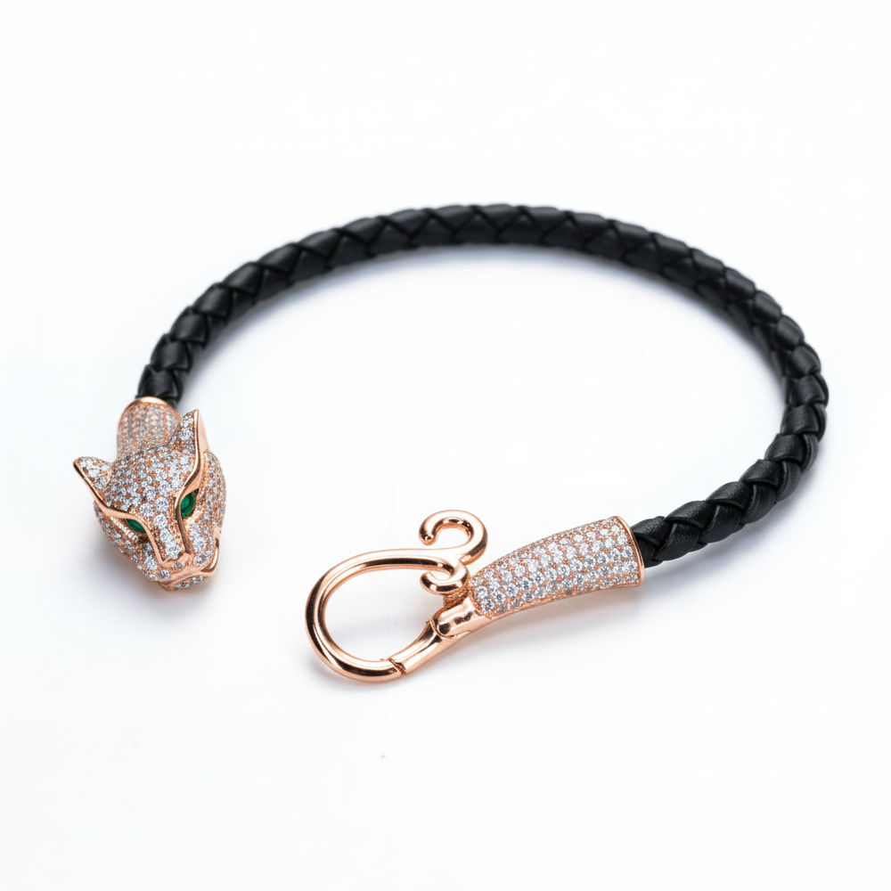 Experience the perfect fusion of luxury and contemporary design with this rose gold-toned panther bracelet. The striking panther head and hook clasp are meticulously paved with brilliant cubic zirconia (CZ) stones, creating a dazzling sparkle. The fierce eyes are accented with vibrant, emerald-tone CZ stones, set against a warm rose gold plating for a truly captivating look. Metal: The metal components are Crafted in 925 Sterling Silver and finished with a luxurious rose gold plating.