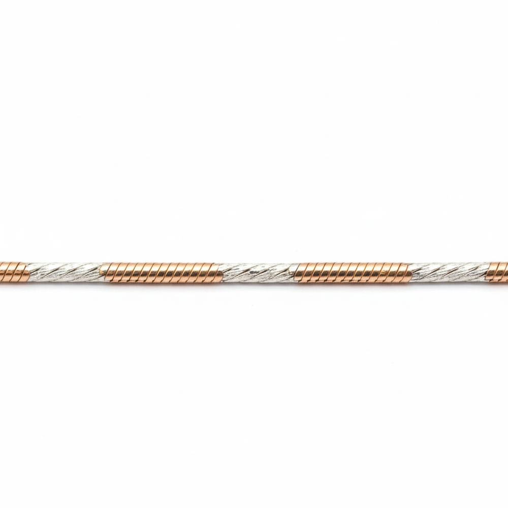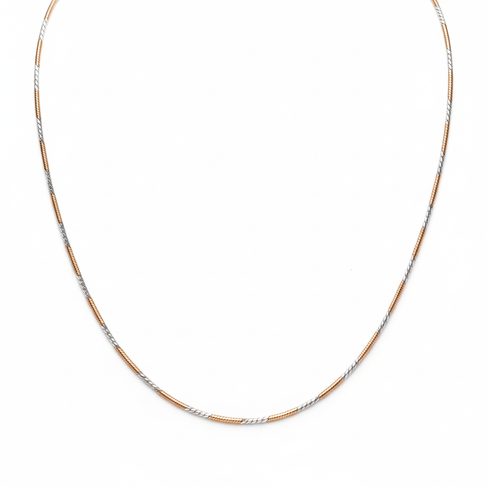This sleek and versatile chain features a classic, fluid snake chain design, beautifully executed in a striking two-tone finish. Alternating rose gold-plated and silver-toned sections create a shimmering, textured effect that catches the light with every movement. Crafted in 925 sterling silver, this chain is comfortable and smooth against the skin, offering a contemporary look whether worn alone or layered with pendants.