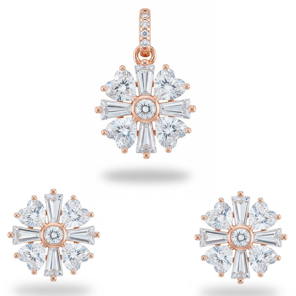 It is a Victorian Style pendant set with baguettes in centre and heart shaped cubic zircons around the boundary to create a truly unique and dazzling flower motif. This timeless set is perfect for gifting, bridal wear, or simply adding a sophisticated sparkle to your everyday ensemble.