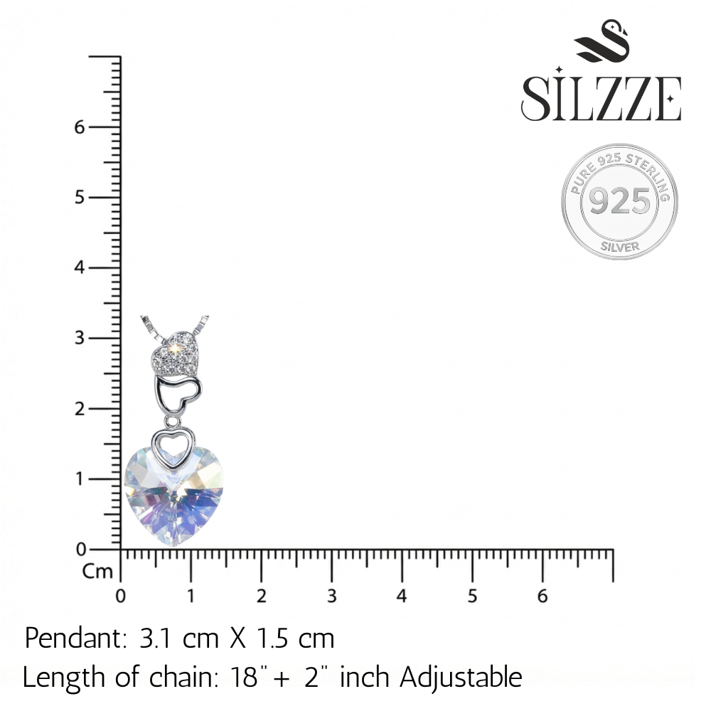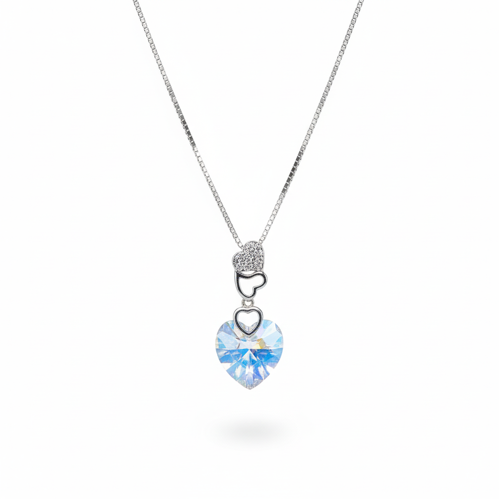 Celebrate the magic of love with this captivating Aurora Borealis Crystal Heart Necklace. The centerpiece is a large, faceted heart-cut crystal that reflects a mesmerizing array of colors pinks, blues, and yellows reminiscent of the northern lights, ensuring a dazzling sparkle with every movement. Crafted in brilliant 925 Sterling Silver, the pendant hangs from a sleek box chain, offering a modern and refined look. This Heart Crystal Necklace makes a romantic and unforgettable gift for her, perfect for Valentine's Day, anniversaries, or special birthdays.