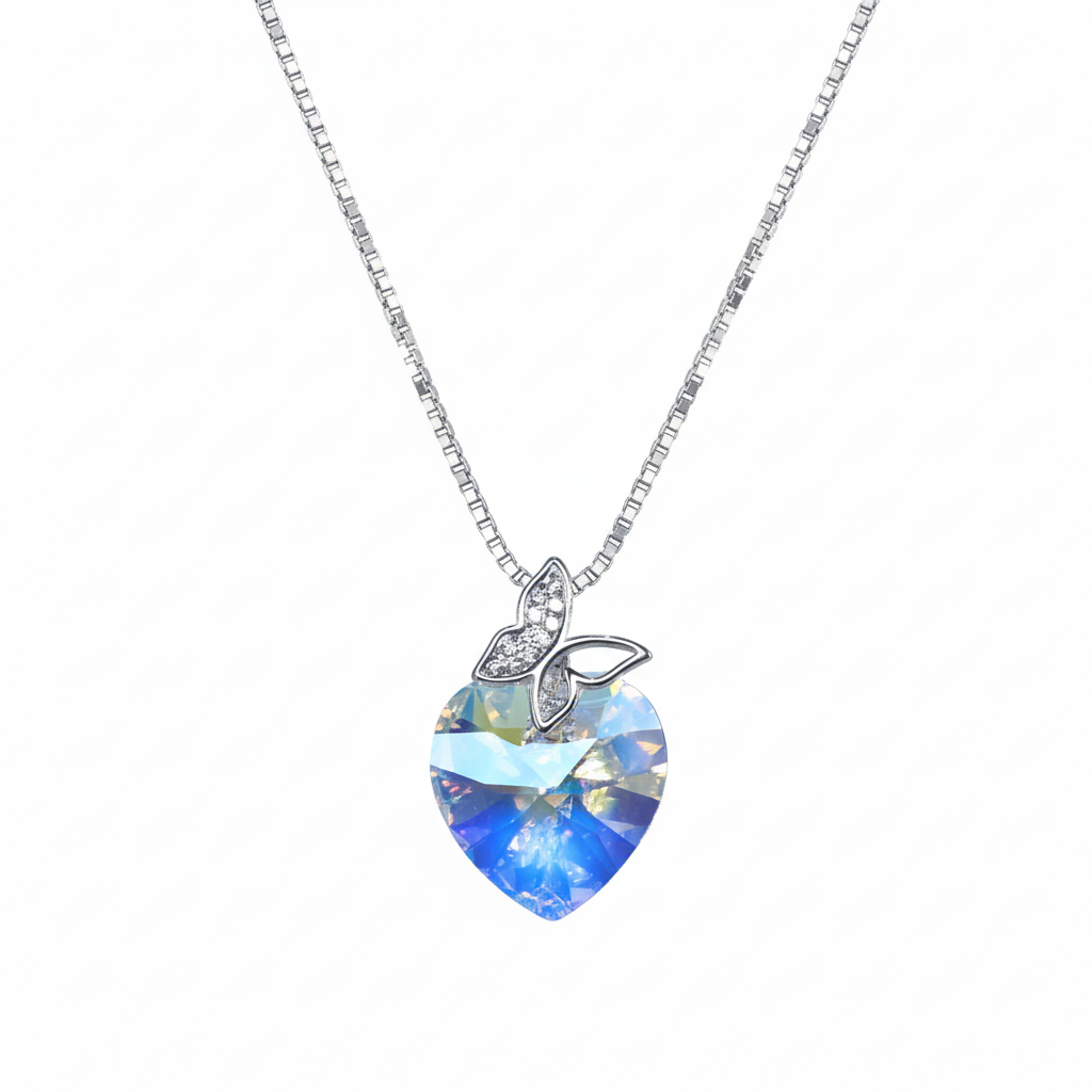 Capture the magic of the night sky with this breathtaking Aurora Heart Crystal Necklace. The centerpiece is a large, precisely faceted crystal cut into a romantic heart shape, featuring a mesmerizing "Aurora Borealis" finish. This treatment allows the crystal to constantly shift colors displaying brilliant flashes of blue, gold, purple, and green ensuring a dazzling sparkle that draws immediate attention. Crafted in luminous 925 Sterling Silver, the pendant hangs from a sleek box chain, offering a refined and secure fit. This Butterfly Heart Necklace is a deeply symbolic and romantic gift for her, representing transformation, love, and wonder.