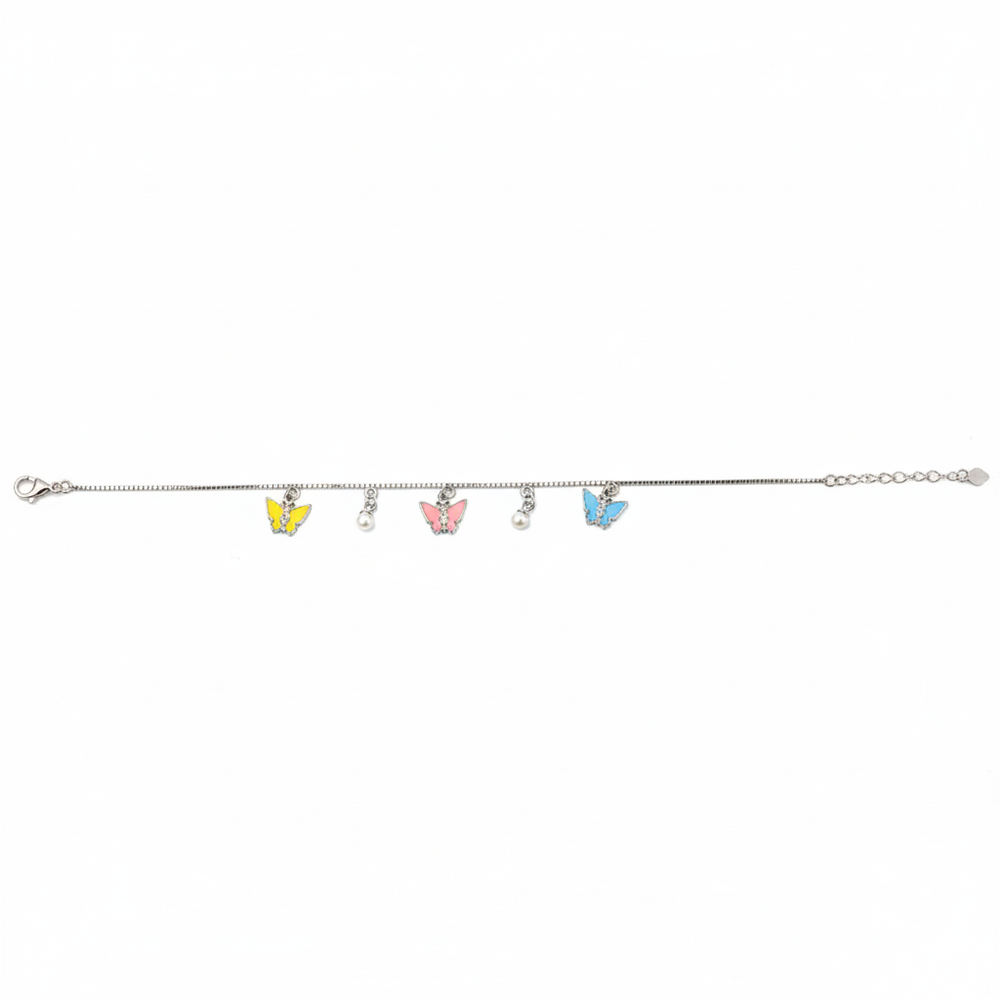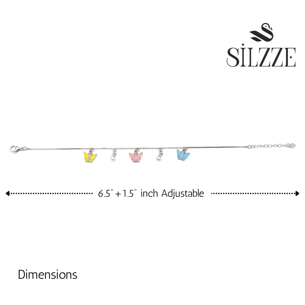 A whimsical and charming piece, this bracelet is crafted from genuine 925 Sterling Silver, featuring a delicate box chain and a sparkling, durable finish. It is adorned with three playful butterfly charms in vibrant enamel colors (Yellow, Pink, and Blue), accented by dangling faux pearl and clear crystal drops.The combination of shiny silver, vibrant enamel, and classic pearls gives it a trendy yet timeless appeal, making it perfect for college students or young professionals. Its lightweight, fluid design sits gracefully on the hand, offering a feminine touch that complements denim, summer dresses, and contemporary kurti sets.