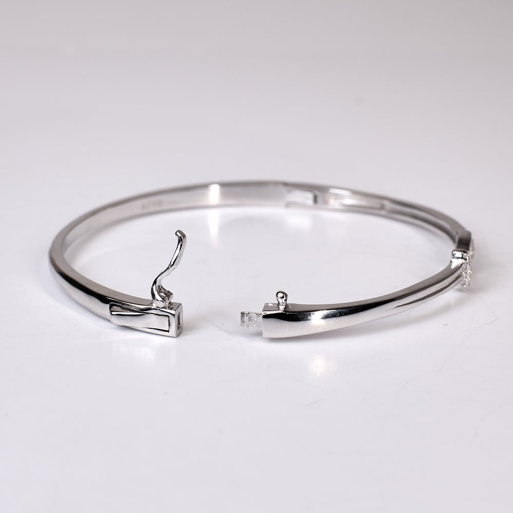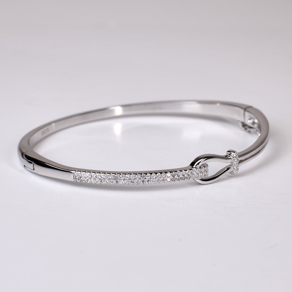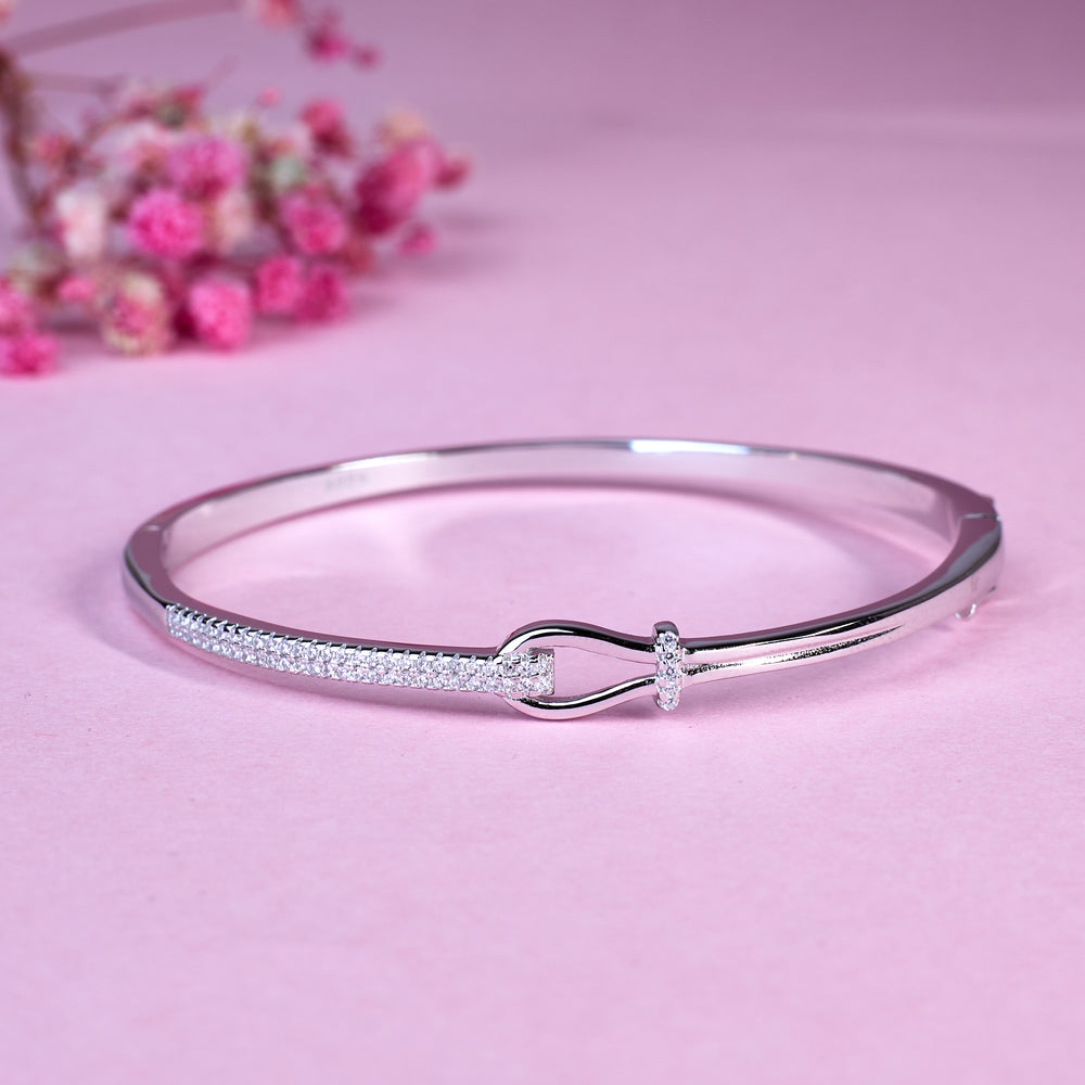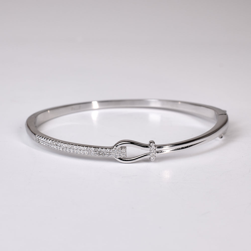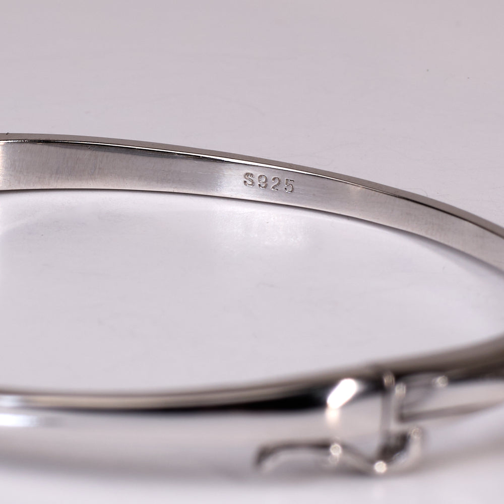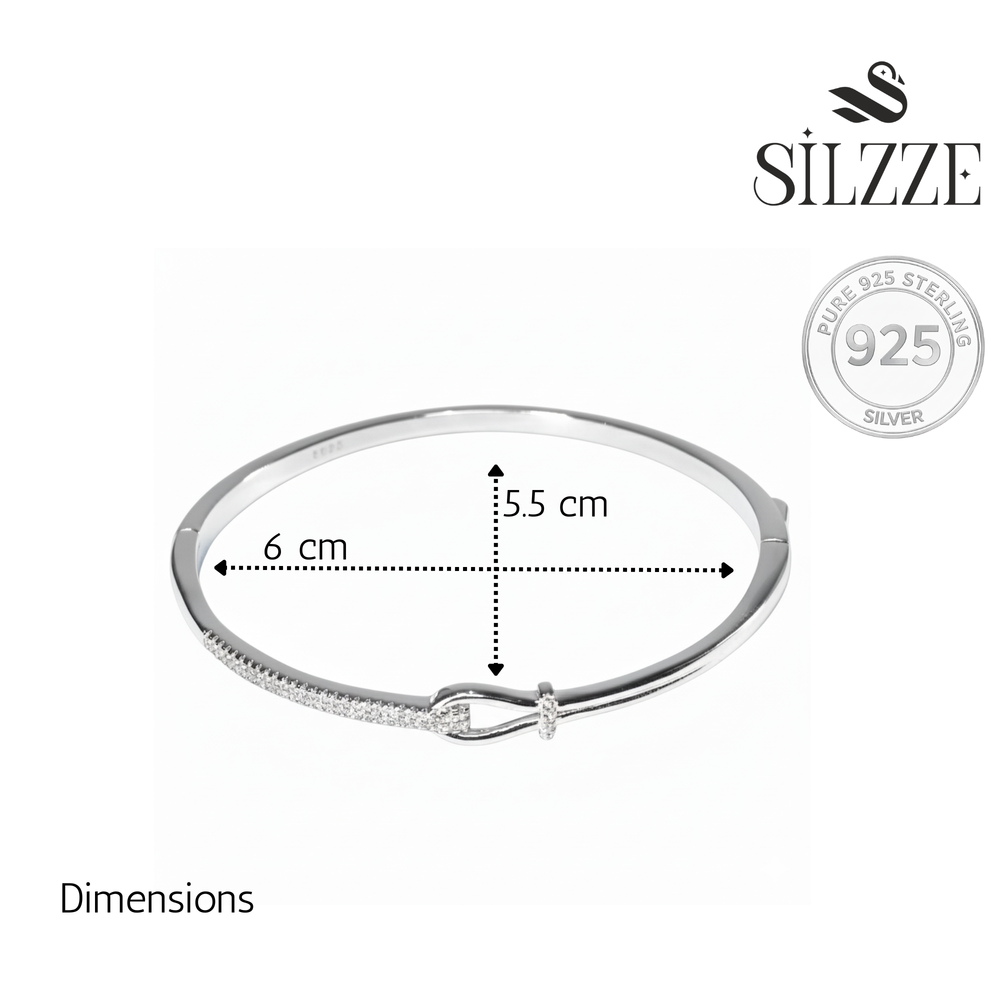 The design features a smooth, highly polished band in a brilliant silver tone, transitioning into a striking clasp mechanism modeled after a stylish hook or shackle. Crafted in 925 Sterling Silver, this bracelet offers durable quality and a radiant, lasting finish. The sophisticated and secure clasp makes this piece a fashionable statement, symbolizing unbreakable connection and strength, perfect for everyday sophistication or special events. The overall aesthetic is both substantial and elegant.