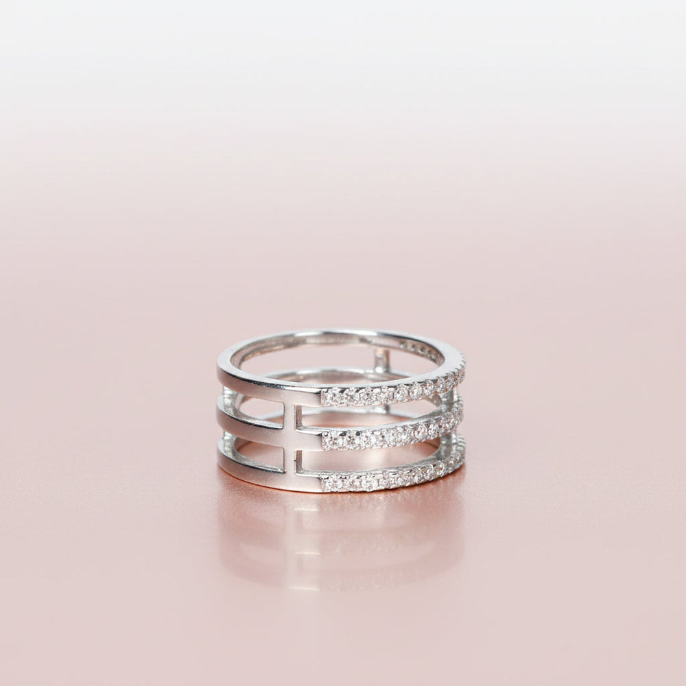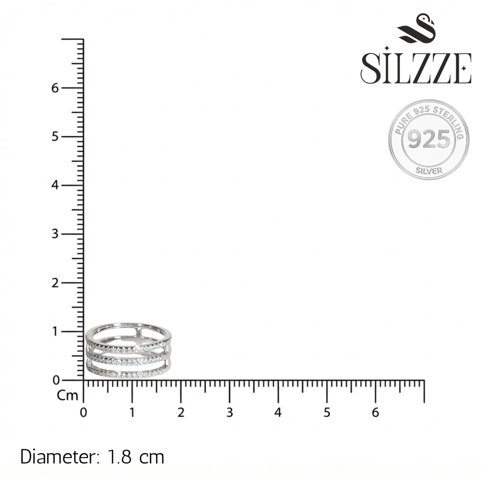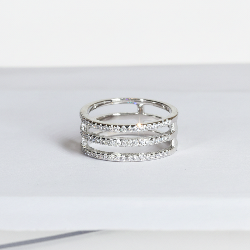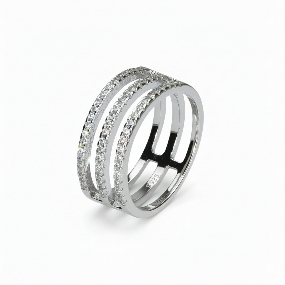 This architectural 925 Sterling Silver ring features a stunning three-row tiered design, meticulously encrusted with a continuous stream of brilliant-cut zircons. This wide-profile band makes a powerful statement on your finger, offering the luxurious appearance of three stacked rings in one seamless piece. Its brilliant shimmer and sophisticated structure make it an ideal choice for adding a touch of modern royalty to your cocktail outfits or festive Indian attire.