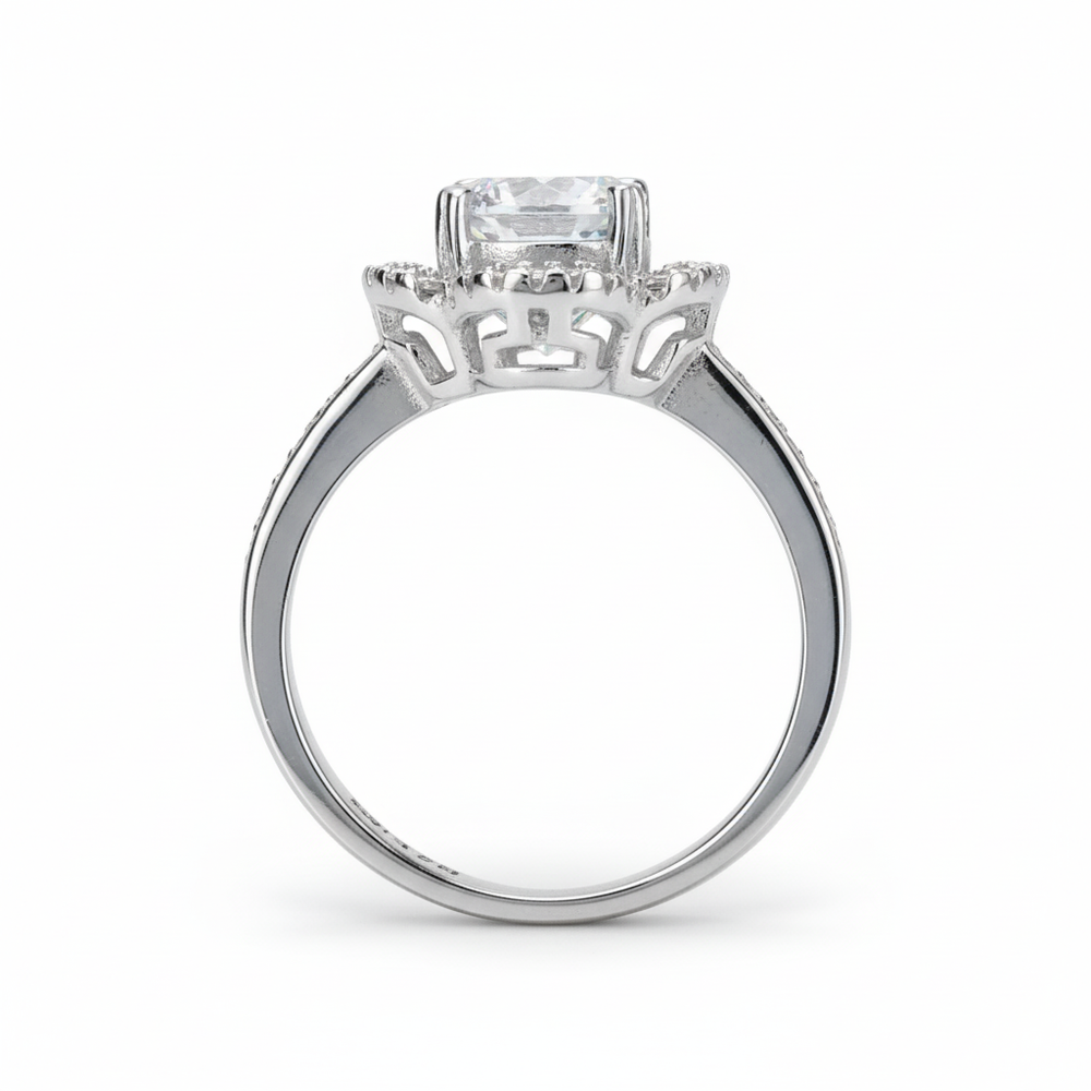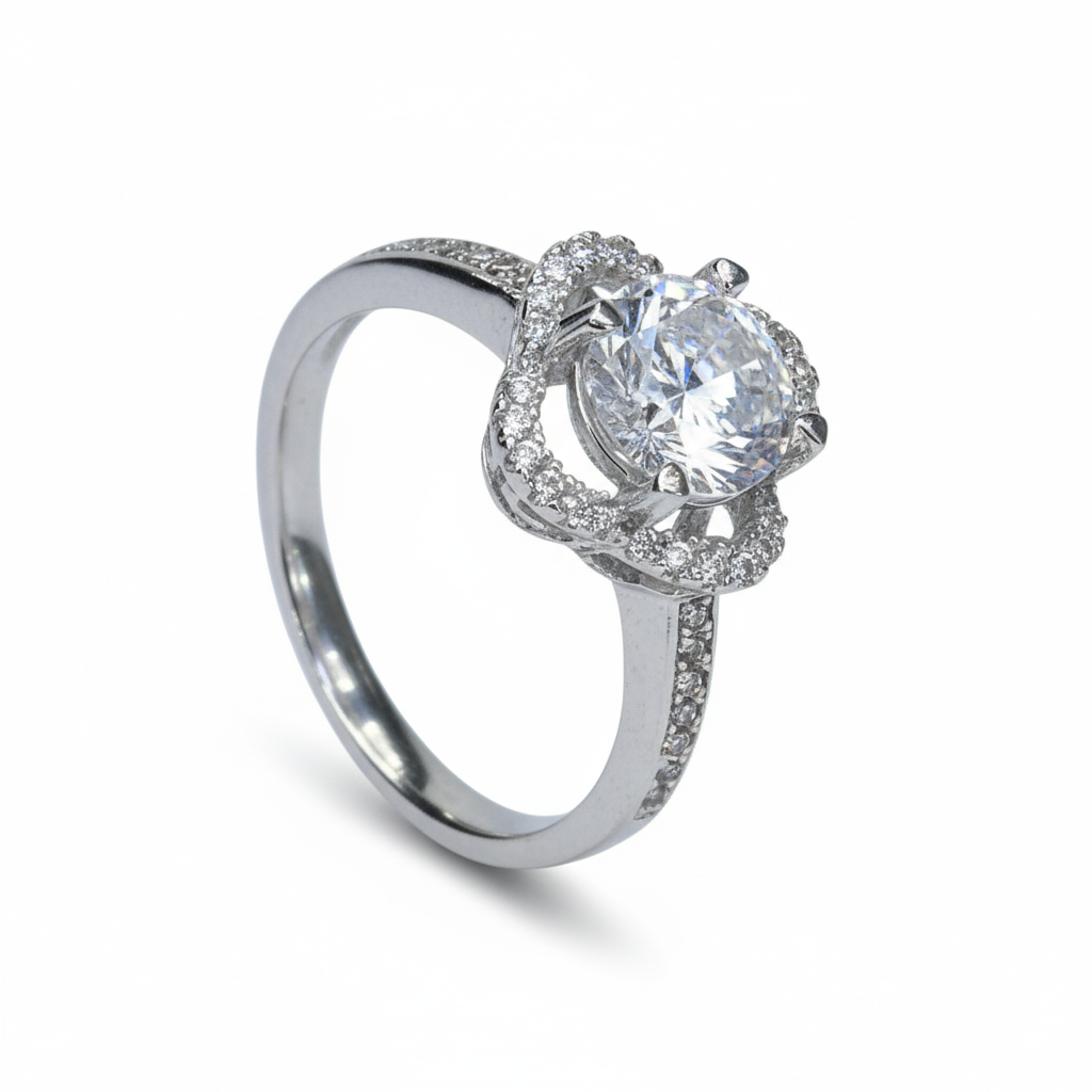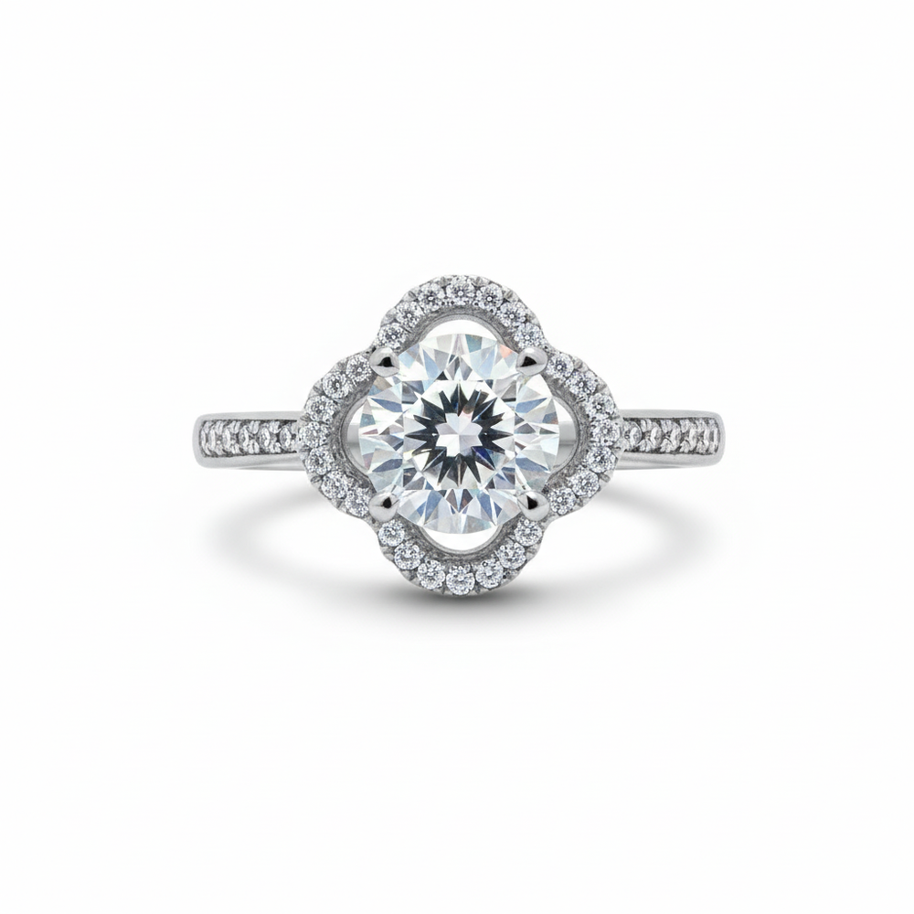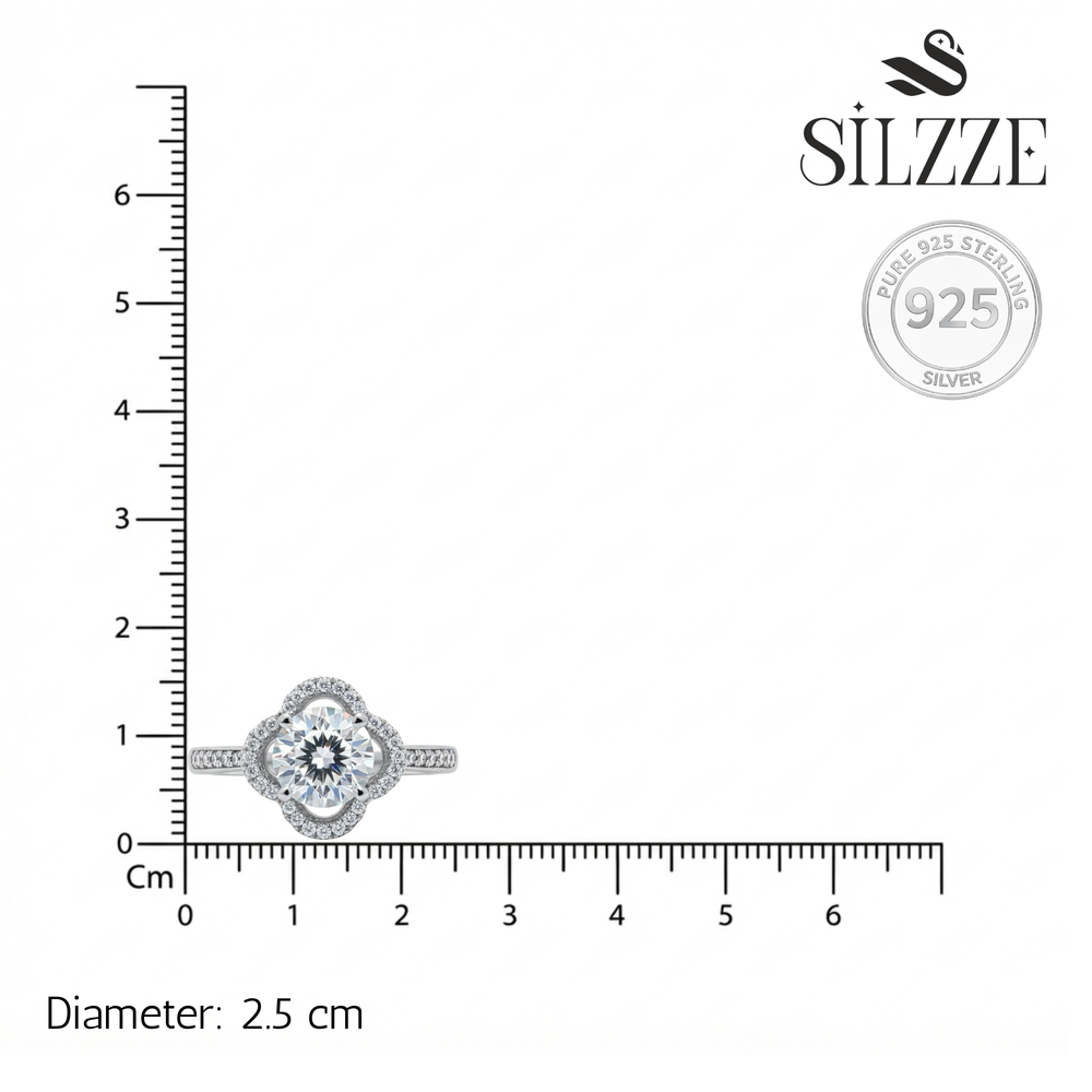 The brilliant round-cut center stone is framed by a dazzling clover-shaped halo of smaller stones, all set on a pave-accented band. Rhodium-plated for superior shine and lasting durability, this ring is an elegant symbol of love, perfect as an engagement ring, a promise ring, or a gorgeous statement piece.