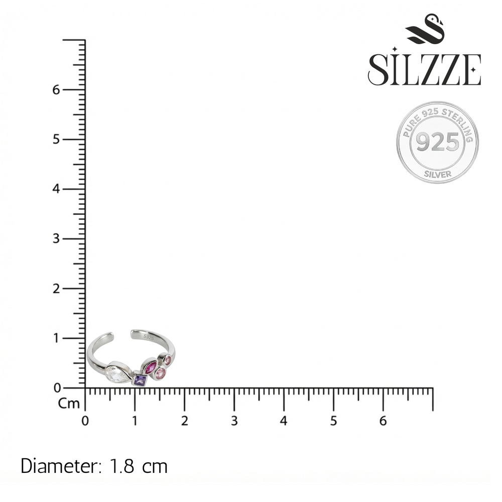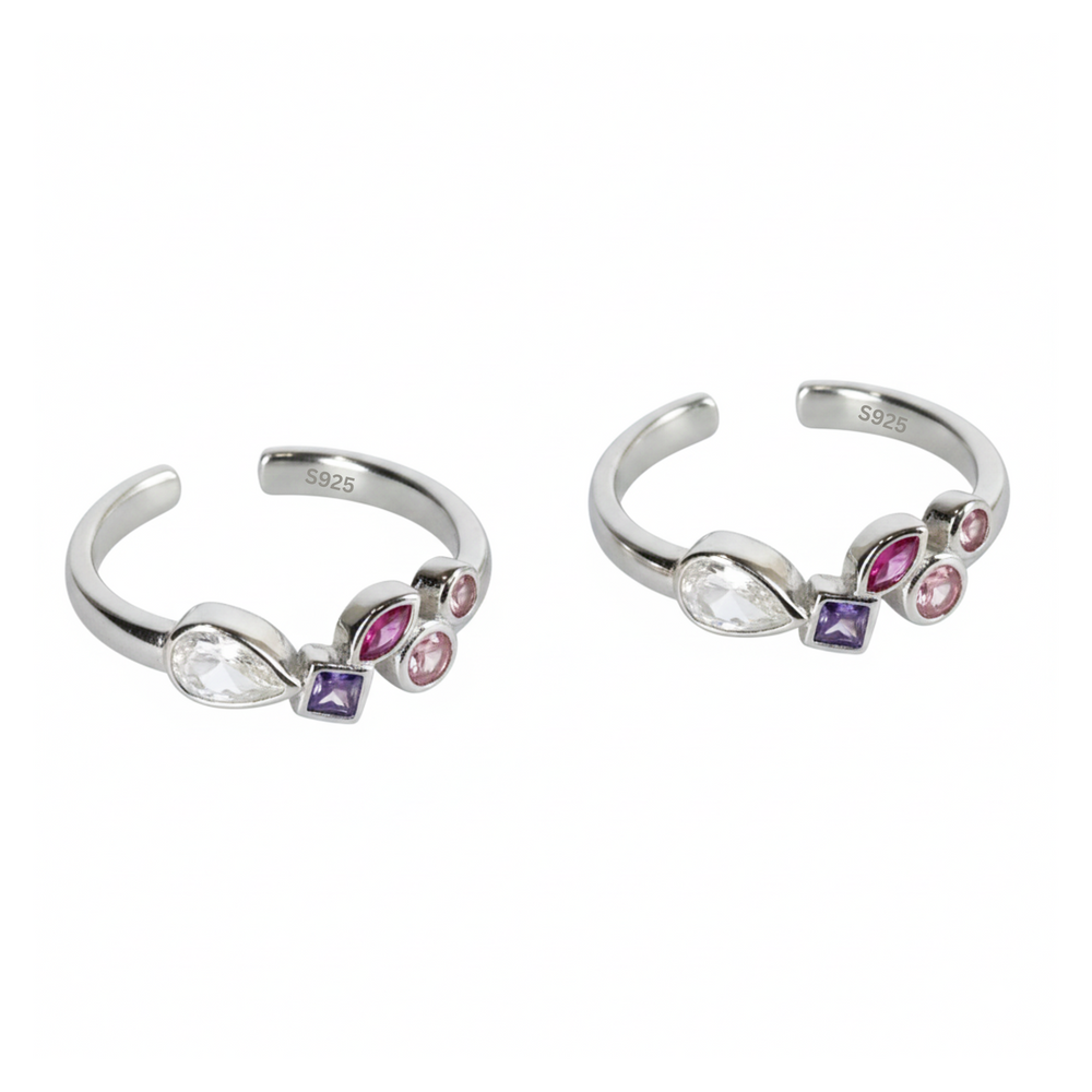 Add a refined sparkle to your look with these multi-stone cluster toe rings. Crafted in 925 Sterling Silver, each ring features an artistic arrangement of pear, square, and round-cut stones in shades of white, purple, and pink. The open-back design ensures a comfortable, adjustable fit for all-day wear. These rings offer a sophisticated way to elevate your footwear, whether you're at the beach or a formal event.