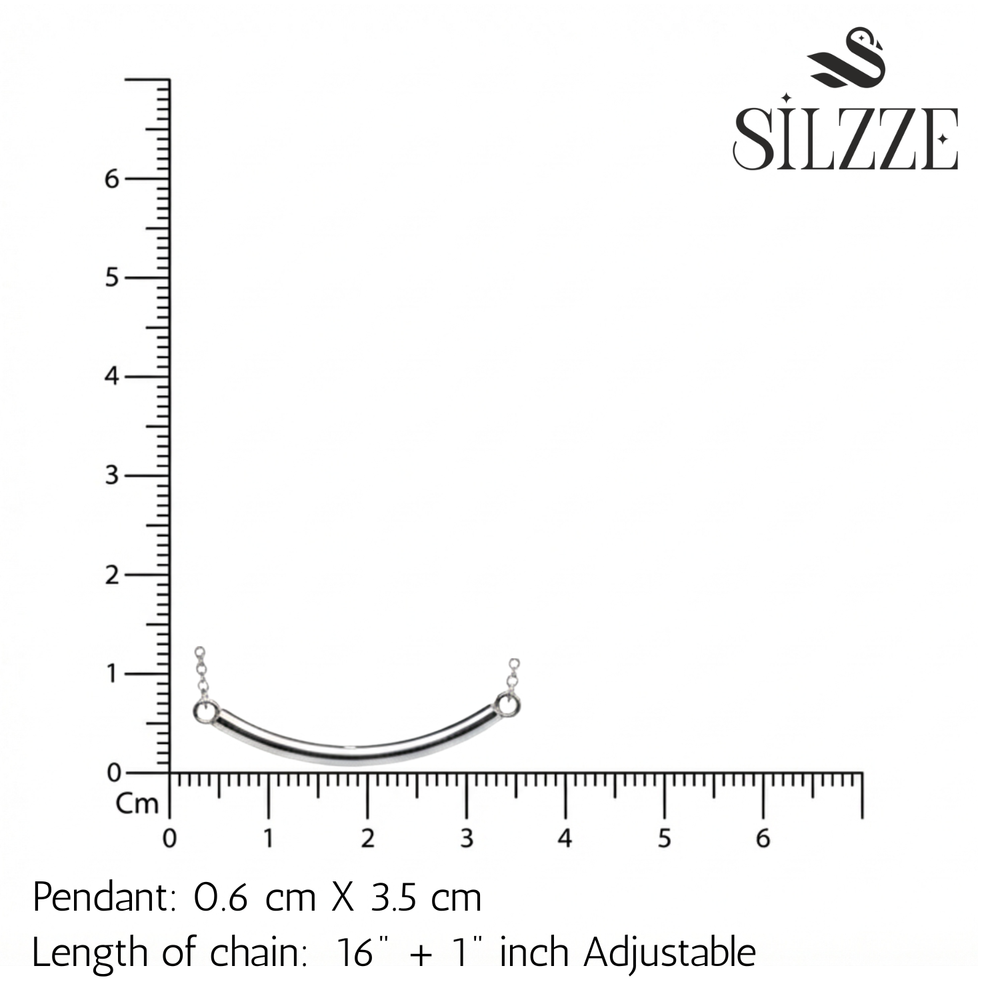 Sleek sterling silver curved bar necklace for a modern, minimalist look.Designed for the modern wardrobe, its polished, slightly curved horizontal bar pendant offers a subtle statement of sophistication.
