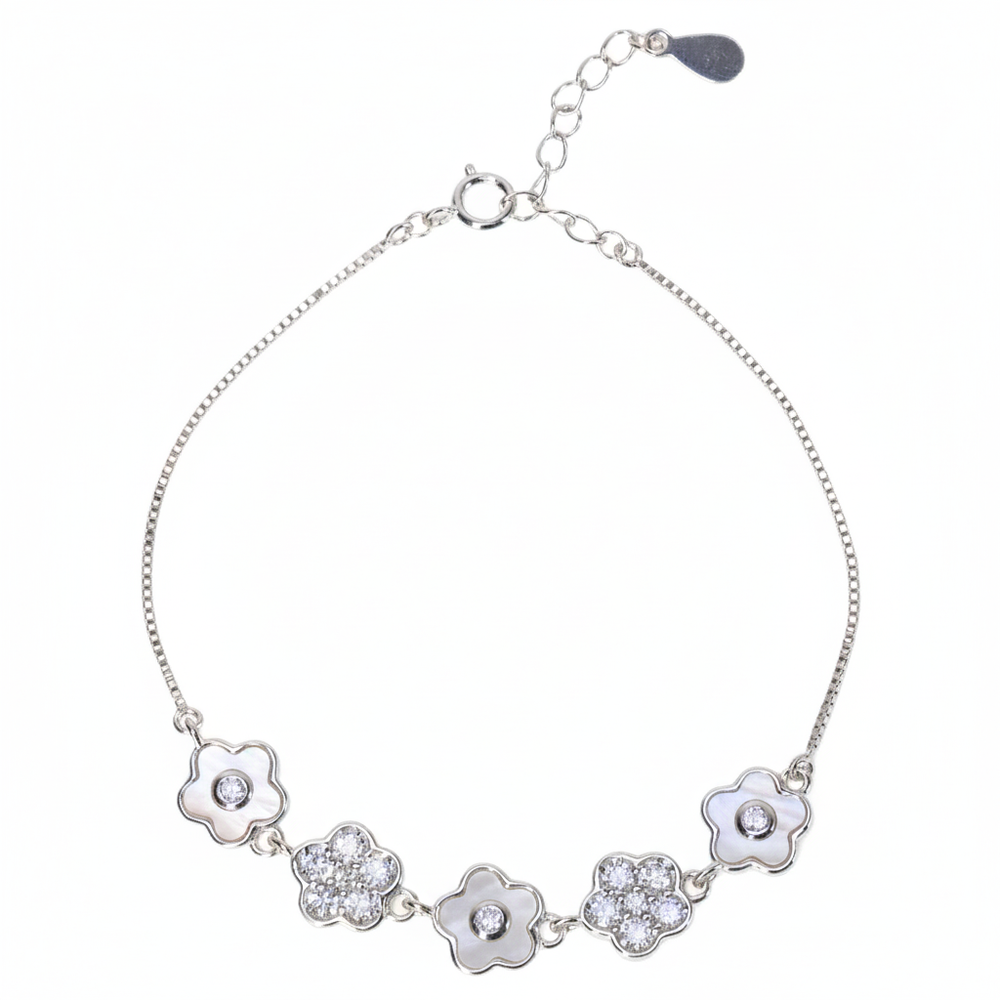 Crafted from genuine 925 Sterling Silver, this delicate bracelet features five charming floral motifs, alternating between luminous Mother of Pearl and dazzling Cubic Zirconia (CZ) diamonds. Its lightweight design allows for comfortable, all-day wear and layers beautifully with watches or other delicate silver jewellery, catching the light and drawing admiring glances.