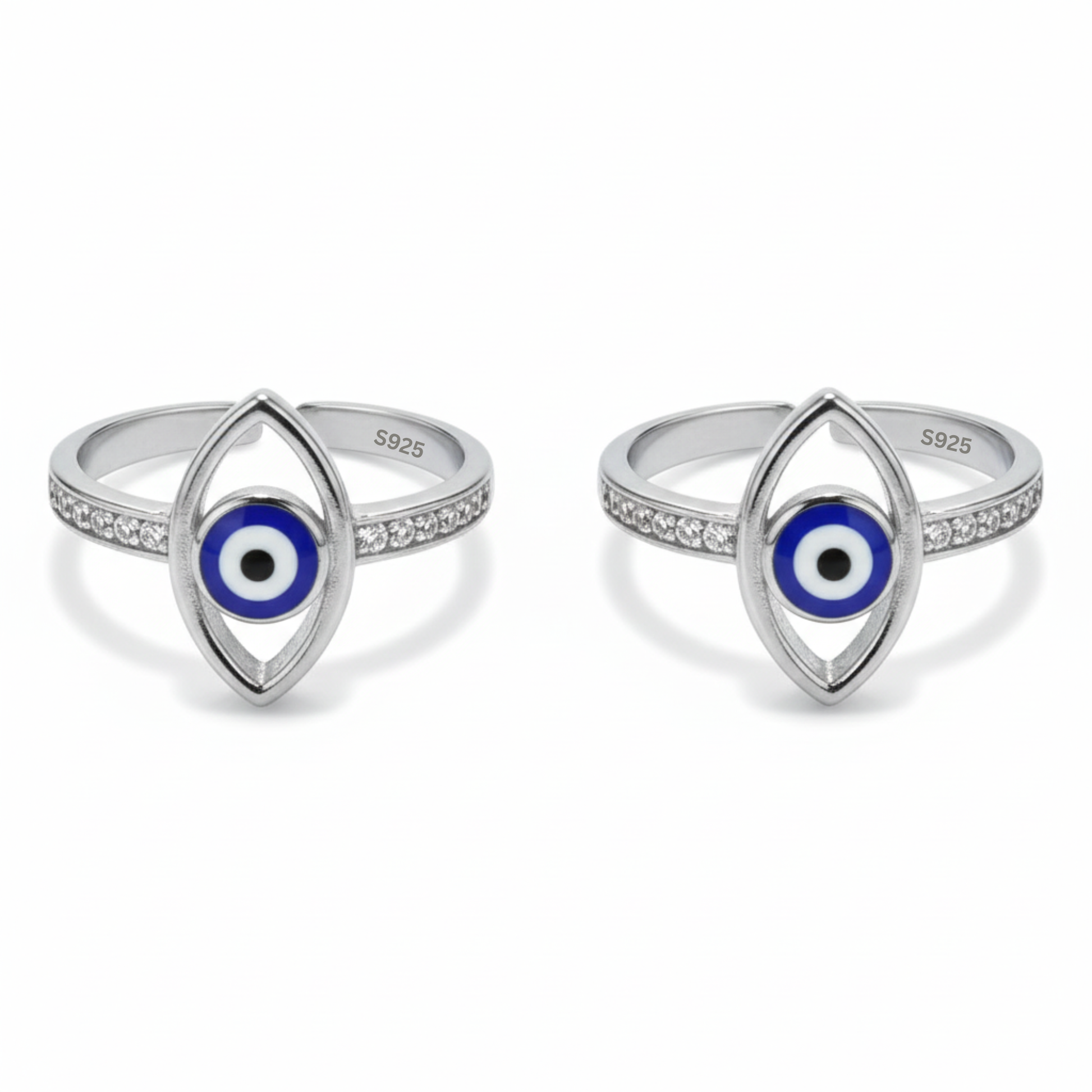 Embrace both style and spiritual protection with this striking evil eye toe ring. Crafted in 925 Sterling Silver, the design features a vibrant blue eye centered within a sleek marquise frame, flanked by shimmering side stones for a touch of elegance. Its adjustable open-band ensures a perfect, personalized fit for any wearer.