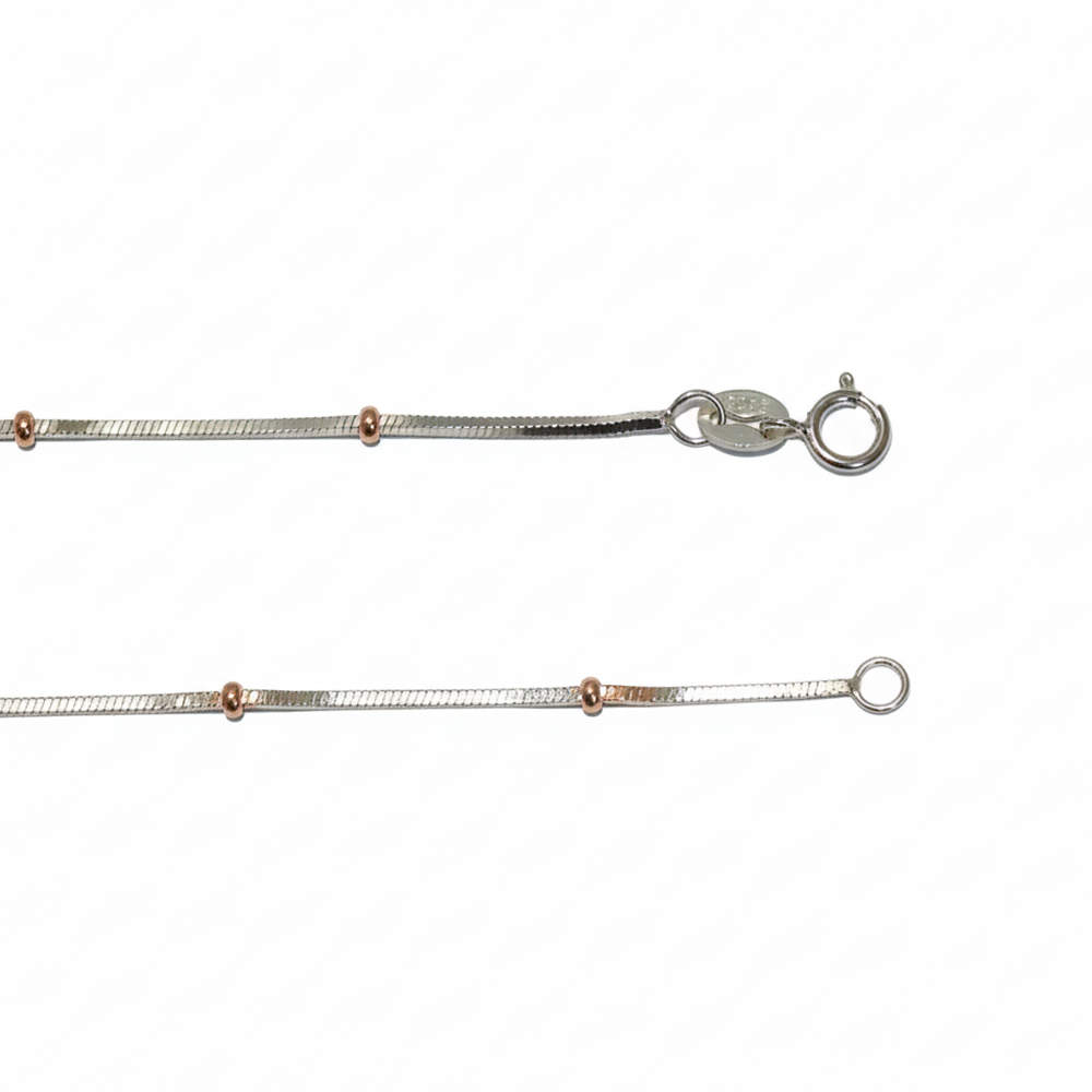 It features a sleek silver snake chain base accented with contrasting Rose Gold beads. This "Mixed Metal" look is a major trend because it allows the wearer to match the necklace with both silver and Rose gold rings or earrings. It’s a modern, sophisticated styling hack that ties your entire jewelry collection together.