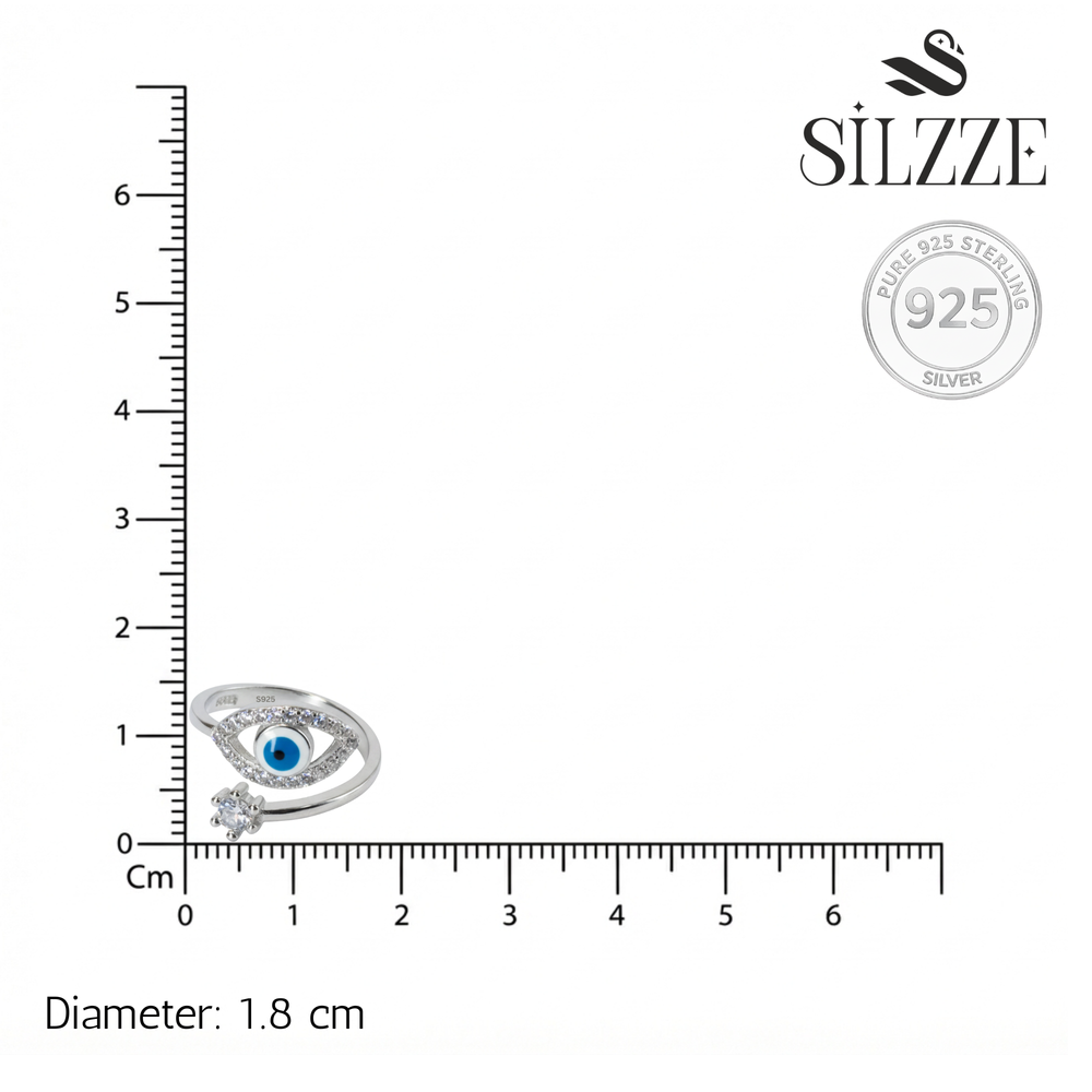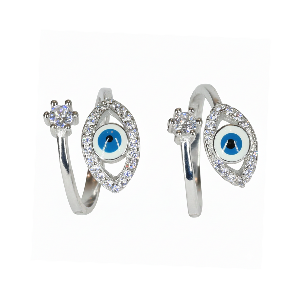 Stay stylish and protected with these stunning Evil Eye toe rings. Crafted in 925 Sterling Silver, the design features a vibrant blue enamel eye surrounded by a shimmering pave border, paired with a brilliant round-cut stone. An S925 stamp ensures the quality of the metal, while the wrap-around adjustable style provides both comfort and a modern edge. These rings are a beautiful blend of ancient symbolism and contemporary sparkle.