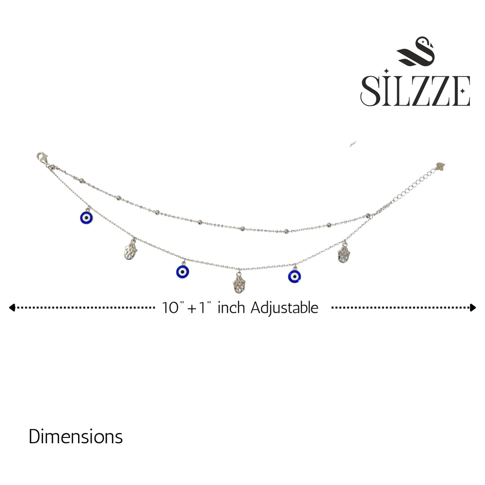 This powerful dual-strand anklet combines two protective symbols-the Evil Eye and the Hamsa Hand-on a delicate 925 Sterling Silver chain with silver beads. It is designed to offer both style and symbolic protection, secured with an adjustable lock.The chains incorporate fine links and small, smooth silver beads, adding texture and movement. This combination of powerful symbols makes the anklet a meaningful and fashionable talisman.The multiple charms and chains draw the eye to the ankle, making it an effortlessly stylish accessory for sandals, heels.