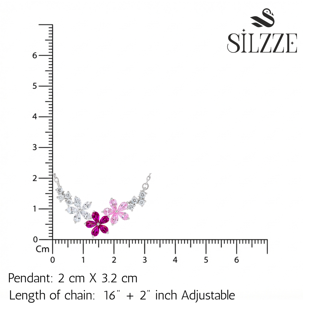 This exquisite 925 Sterling Silver necklace features a delicate arrangement of sparkling floral pendants. Adorned with brilliant cubic zirconia stones in shades of clear, soft pink, and vibrant magenta, the design evokes the fresh beauty of a blooming garden. It is the perfect piece to add a touch of feminine grace and subtle color to any outfit, crafted with lasting quality and shine. It will instantly brighten your complexion and add a captivating sparkle that complements your natural beauty.