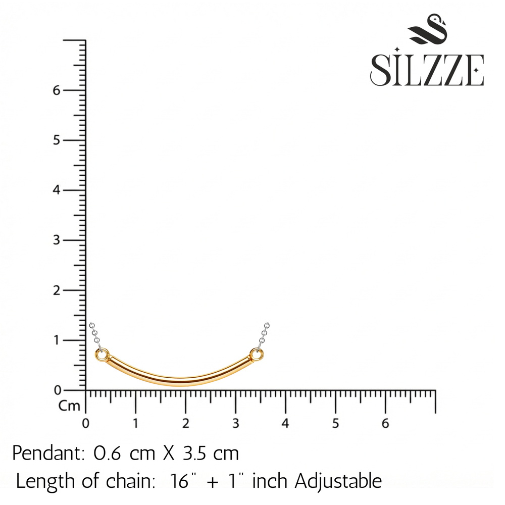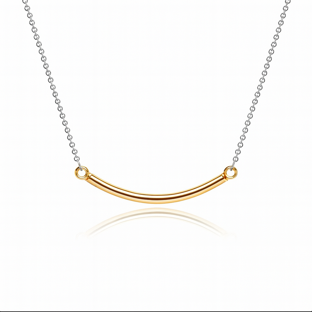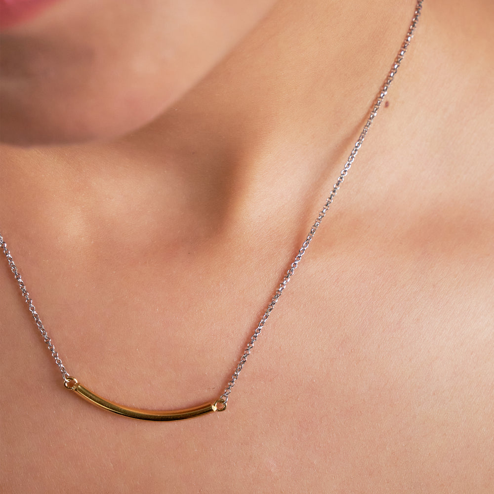 This minimalist piece is the definition of understated chic, featuring a sleek, gently, curved bar pendant finished in a luxurious gold plating. The bar is perfectly suspended on a delicate yet durable sterling silver chain.