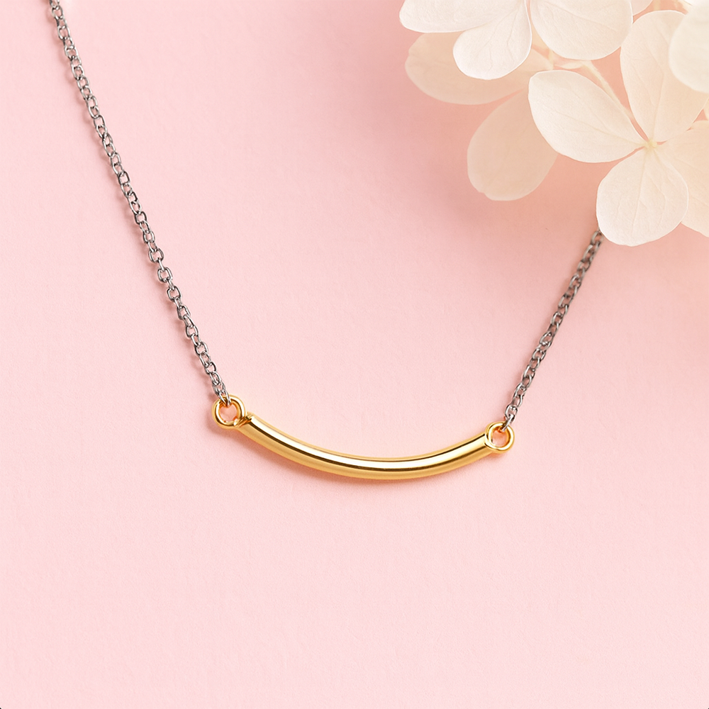 This minimalist piece is the definition of understated chic, featuring a sleek, gently curved bar pendant finished in a luxurious gold plating. The bar is perfectly suspended on a delicate yet durable sterling silver chain, creating a stunning two-tone effect.