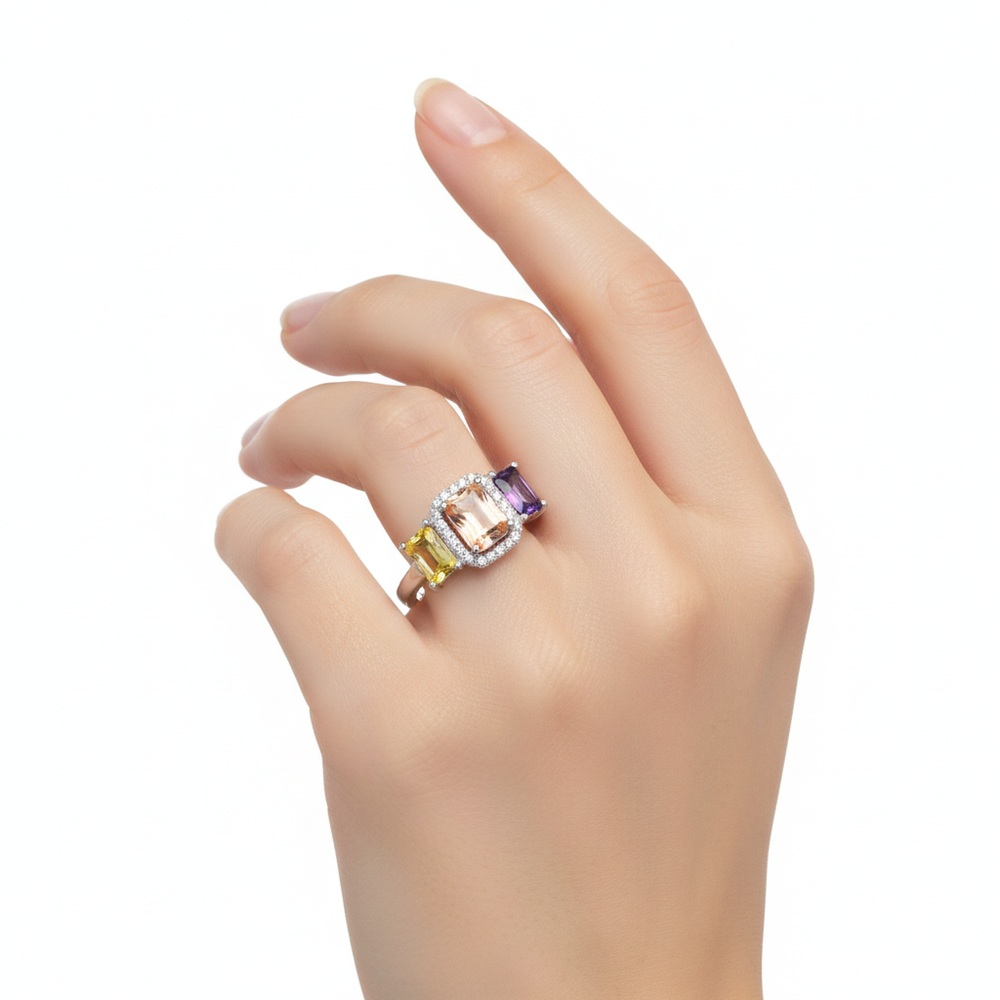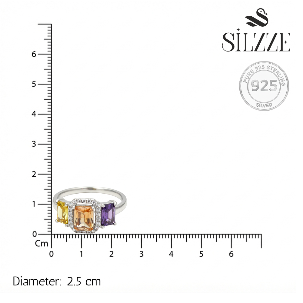 This striking three-stone ring features a warm amber-toned emerald-cut center stone, elegantly flanked by vibrant yellow and deep purple side stones. Crafted in 925 sterling silver, the central stone is highlighted by a delicate shimmering halo that adds a luxurious, high-shine finish. You’ll love this piece for its bold, sunrise-inspired color palette that provides a sophisticated advantage, making it a perfect, durable gift that symbolizes creativity and vibrant energy.