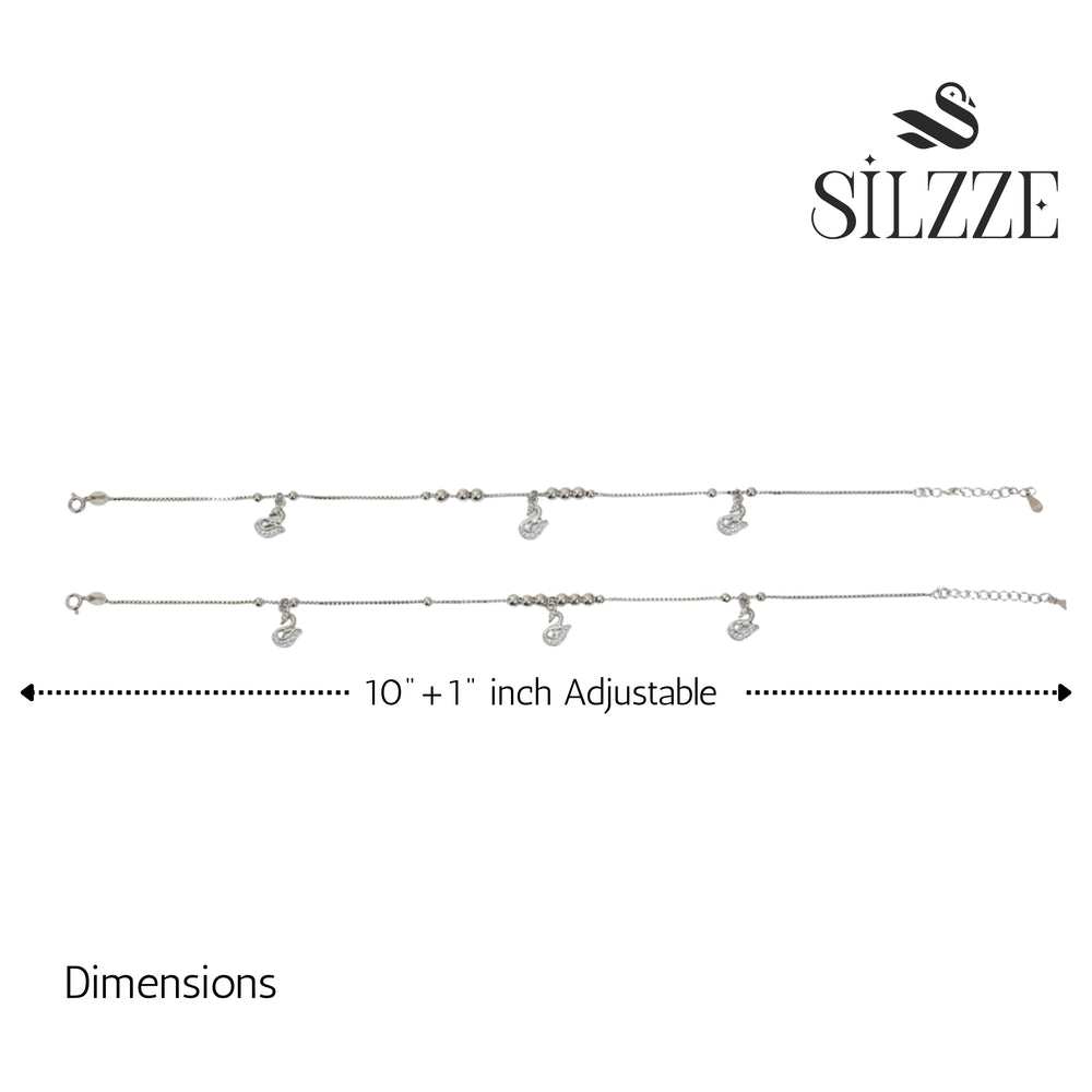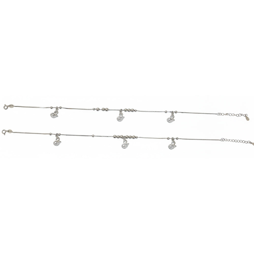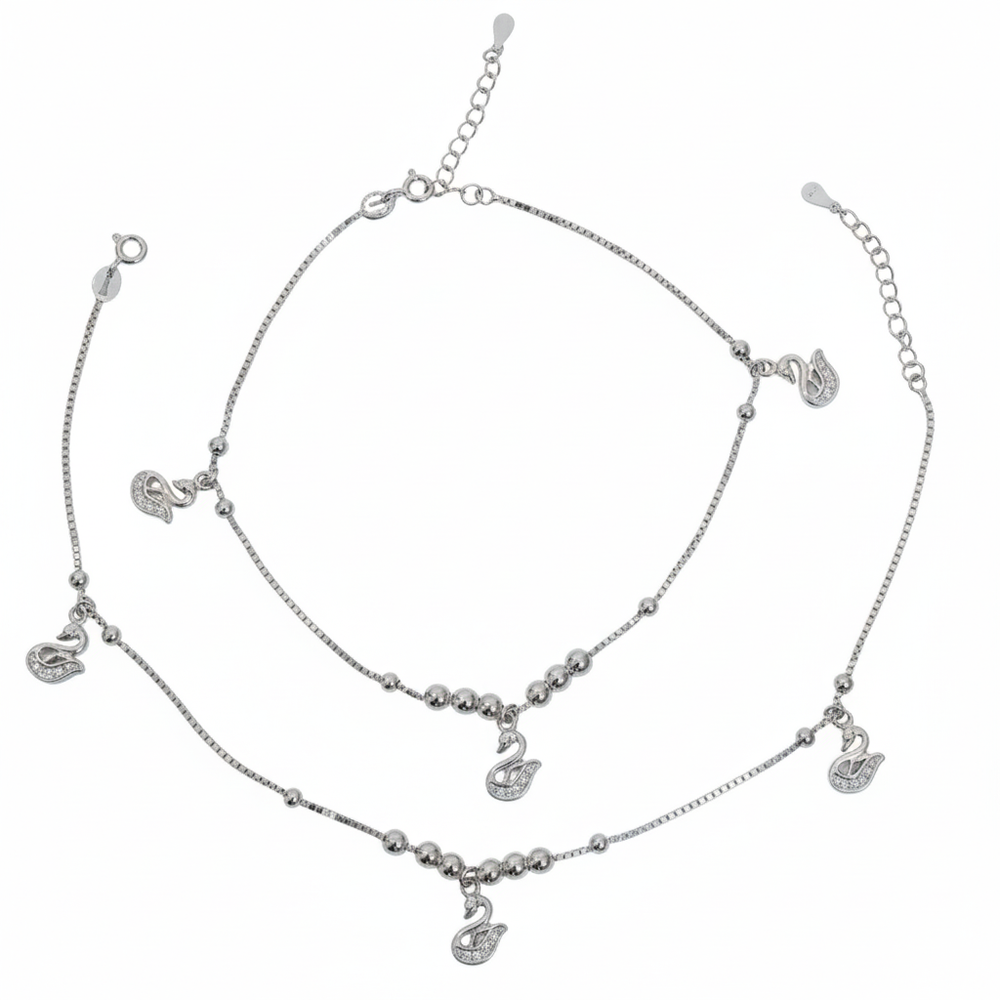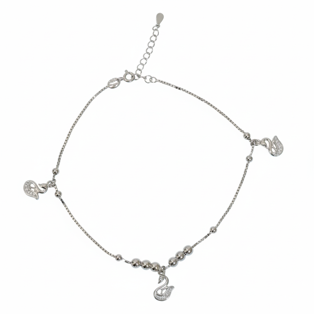 Crafted from high-quality 925 Sterling Silver, this anklet captures the effortless elegance of the swan. The design combines a fine box chain with sections of smooth silver beads, creating delicate movement and visual interest. The piece is adorned with three beautifully sculpted swan charms, each intricately set with brilliant micro CZ stones to enhance their sparkle. The swan motif is cherished for its association with love, loyalty, and poise, making this piece a wonderfully meaningful accessory. It fastens with an adjustable spring-ring lock and extension chain, ensuring both a secure and comfortable fit.The detailed, sparkling charms act as miniature focal points, subtly drawing attention to your footwear or bare feet with a touch of timeless beauty.