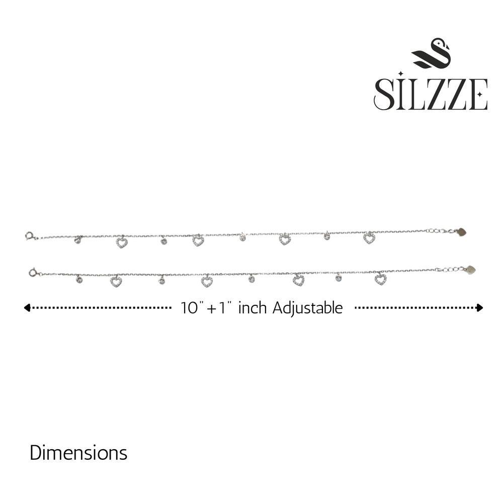 The delicate, polished chain is brought to life by alternating dangle charms: beautifully detailed, open heart motifs meticulously set with shimmering Pave Cubic Zirconia (CZ), and sparkling bezel-set round CZ stones. This mesmerizing arrangement ensures a dynamic, light-catching movement with every step. this anklet promises both a perfect fit and an instant elevation of style. It is the definitive accessory for adding romantic sparkle to any ensemble, making it an unforgettable gift or a treasured personal indulgence.