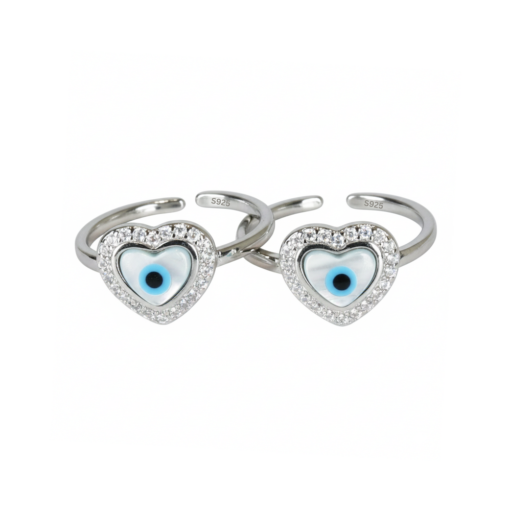 Crafted in 925 sterling silver, these exquisite toe rings combine timeless protection with modern elegance. Each ring features a mesmerizing heart-shaped evil eye center, beautifully framed by a halo of shimmering cubic zirconia stones. The adjustable open-band design ensures a seamless fit, making them a perfect accessory for barefoot walks on the beach or adding a touch of sparkle to your favorite sandals.