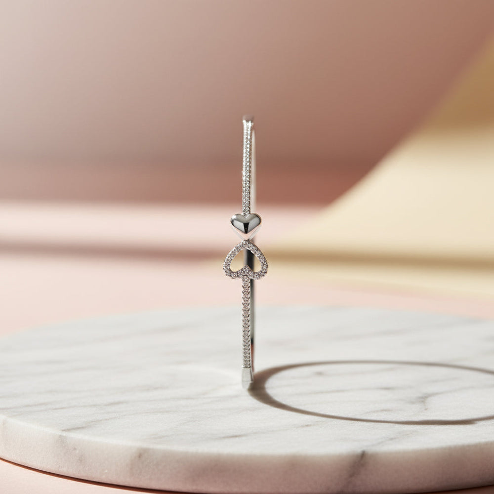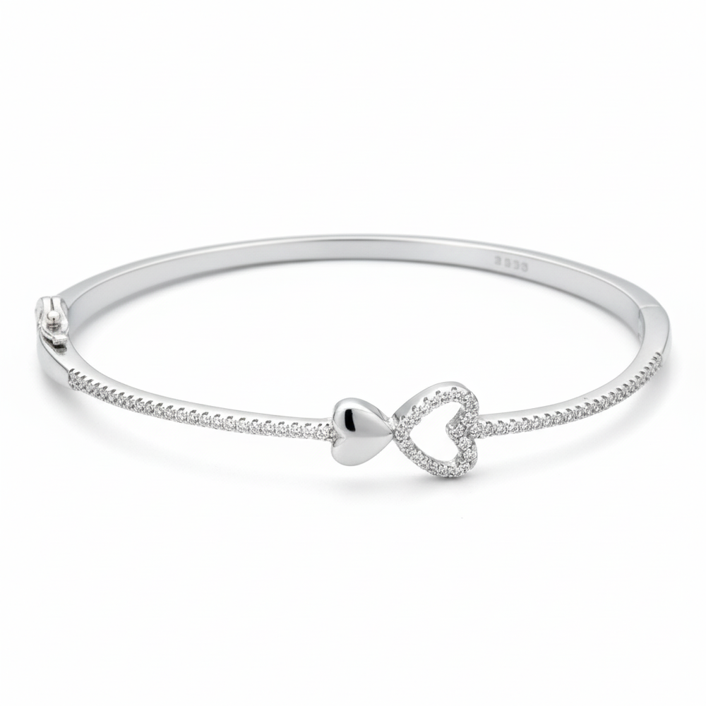 Capture the essence of eternal romance with this exquisite hinged bracelet. Featuring a sleek, highly polished band that curves elegantly around the wrist, the centerpiece showcases a delicate yet powerful symbol of affection: a beautifully integrated double-heart design. Crafted in 925 Sterling Silver, this bracelet offers exceptional quality and a radiant, lasting finish. This piece is the perfect expression of everlasting connection, making it an ideal gift for an anniversary, Valentine’s Day, or any occasion celebrating love.