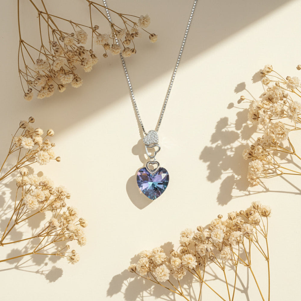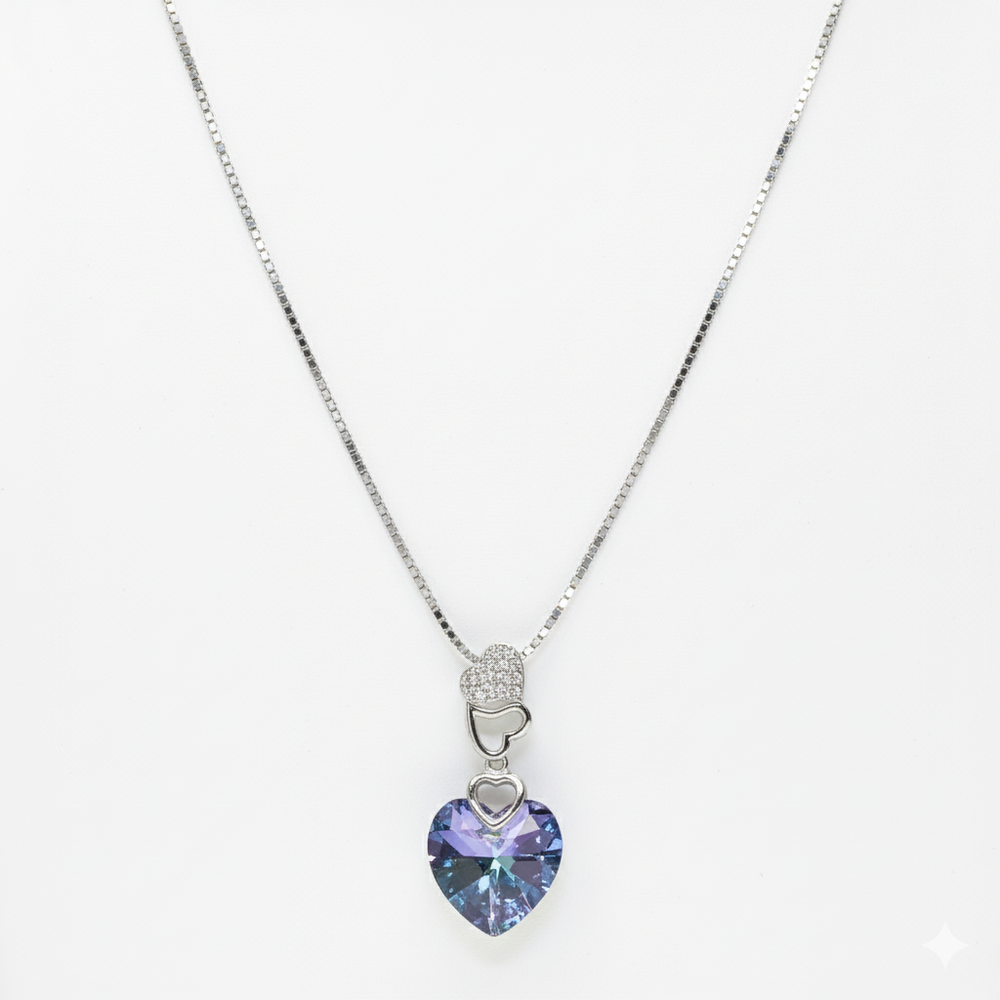 Symbolize unbreakable connection and deep passion with this sophisticated double-heart necklace. Suspended from an elegant, silver-toned Box Chain, the pendant showcases a dramatic arrangement of three hearts. This crystal is securely capped by two smaller, intertwined heart motifs: one is a smooth, open heart, and the one above it serves as the bale, featuring a brilliant micro-pavé cubic zirconia setting. Crafted in 925 Sterling Silver, this necklace provides a secure setting and a radiant, lasting finish.
