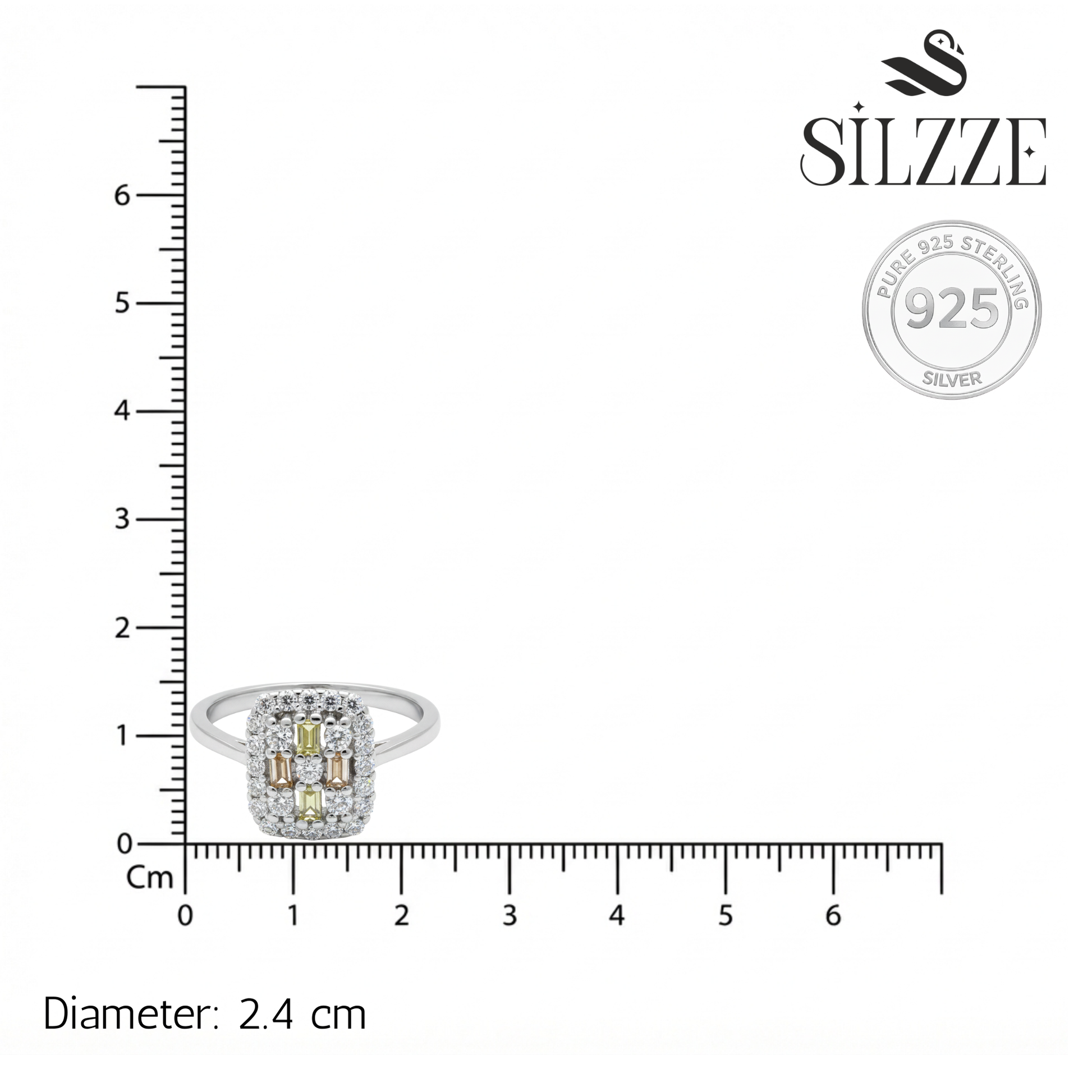 Make a dazzling impression with this multi-layered statement piece. Featuring a central cross-pattern of lemon yellow baguette accents surrounded by a double border of brilliant-cut shimmering stones, this ring captures light from every angle. Crafted in 925 sterling silver, its substantial yet refined profile offers a high-end look with a bright, tarnish-resistant finish.