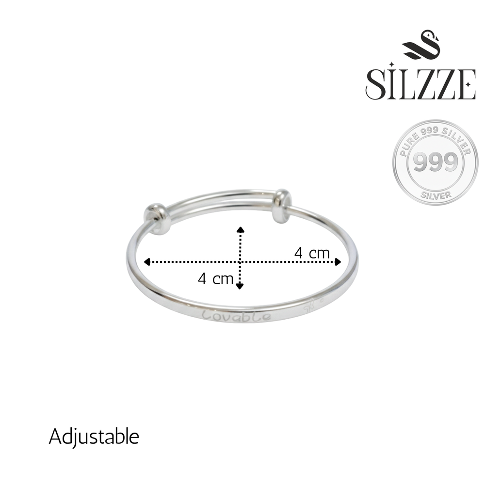 Crafted from exceptionally pure 999 Fine Silver, this pair of baby kadas features a classic, adjustable design that grows with the child. The bangles are elegantly polished and detailed with subtle, colorful enamel lettering ("Loveable") and a tiny charm, ensuring both purity and beauty. These sleek, adjustable kadas offer a traditional yet modern touch, sitting comfortably and securely on the baby's wrist. The high purity of 999 silver makes it an auspicious and cherished gift for newborns and infants, adding a delicate shine to their tiny hands.
