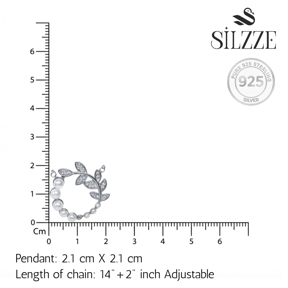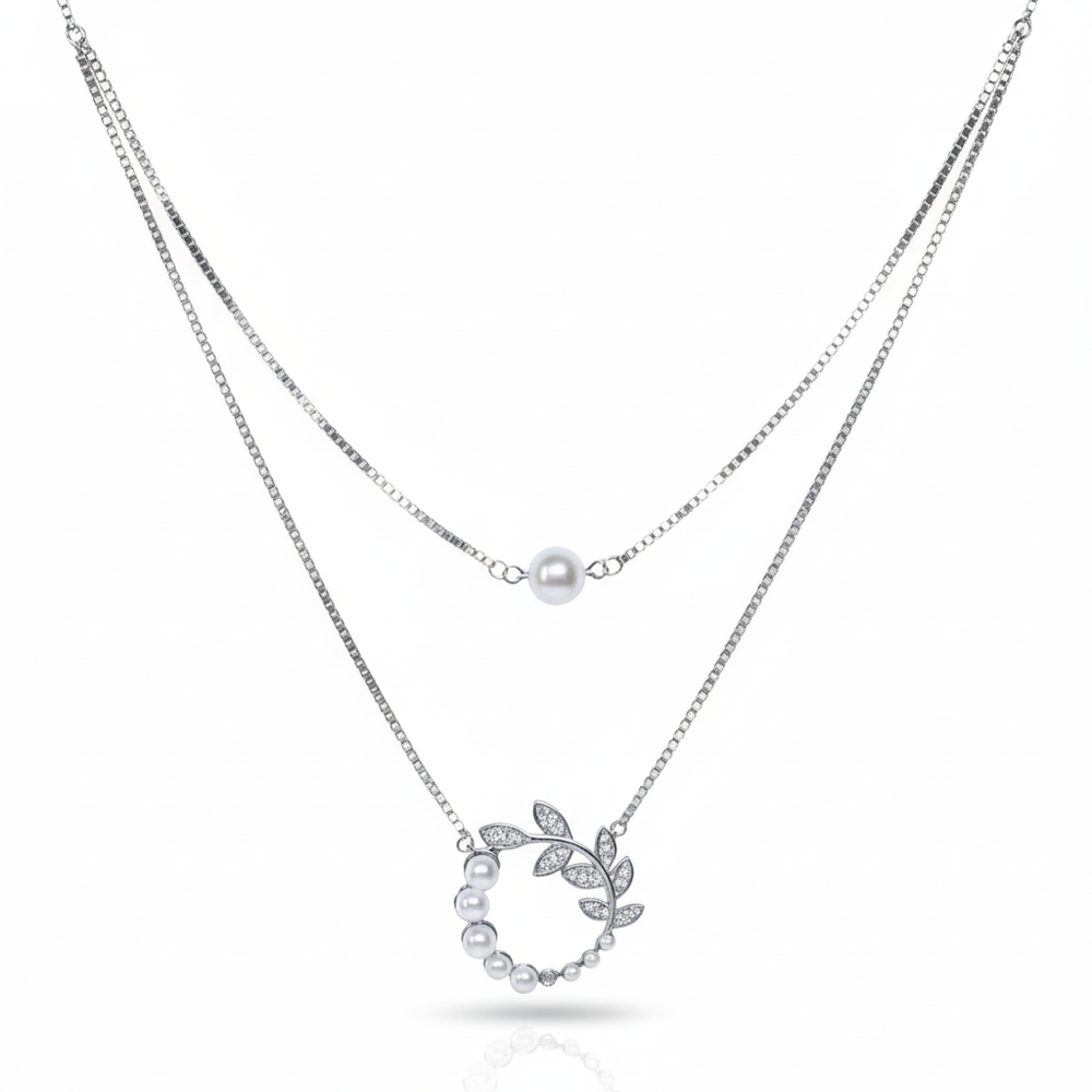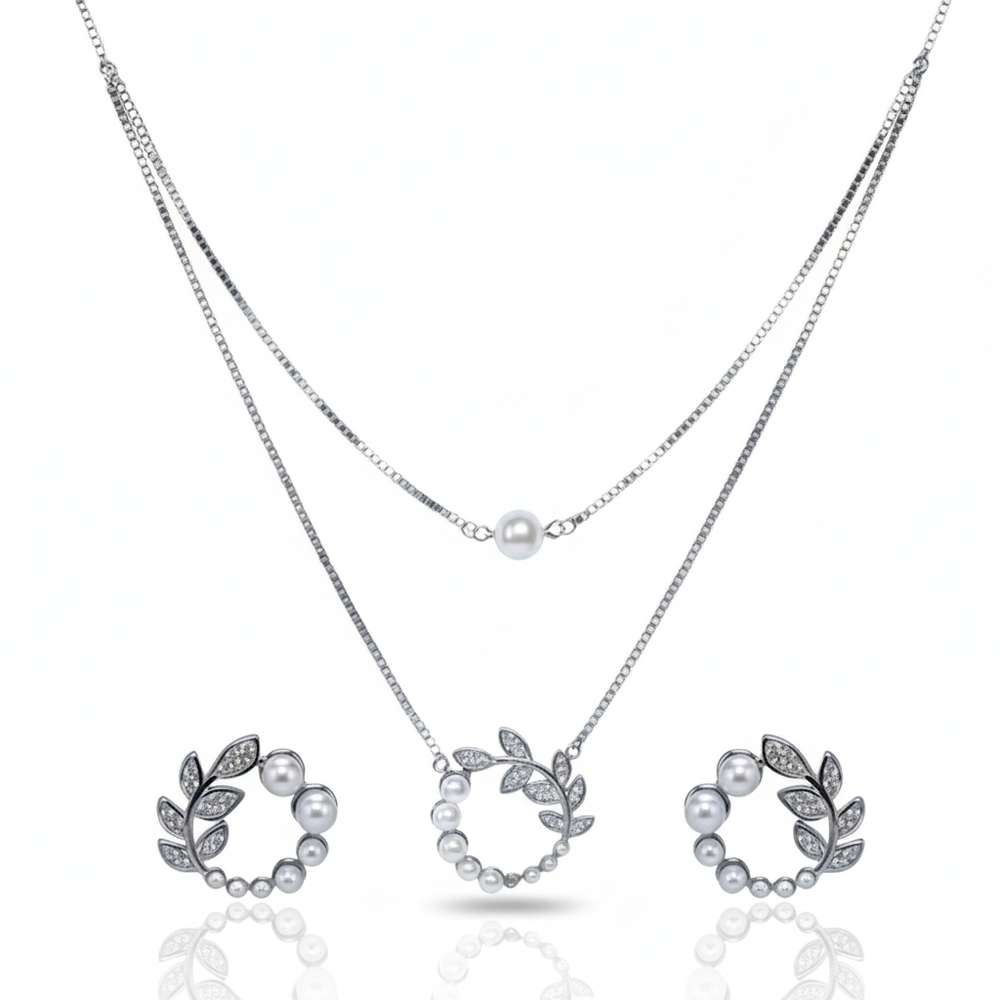 Elevate your elegance with this exquisite jewelry set featuring a delicate layered pearl necklace and matching nature-inspired wreath earrings. Crafted in 925 sterling silver, each piece is intricately detailed with shimmering cubic zirconia leaves and lustrous pearls to create a look of sophisticated luxury. This versatile set transitionally effortlessly from a professional day at the office to a glamorous evening gala.