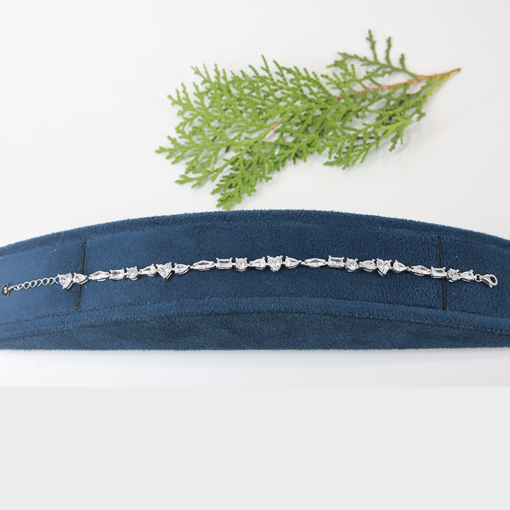 The random, yet balanced, setting of multiple precision-cut stones (like miniature diamond simulants) gives the piece an expensive, custom-made feel. Its flexible design drapes beautifully on the wrist, adding a rich, textural element.