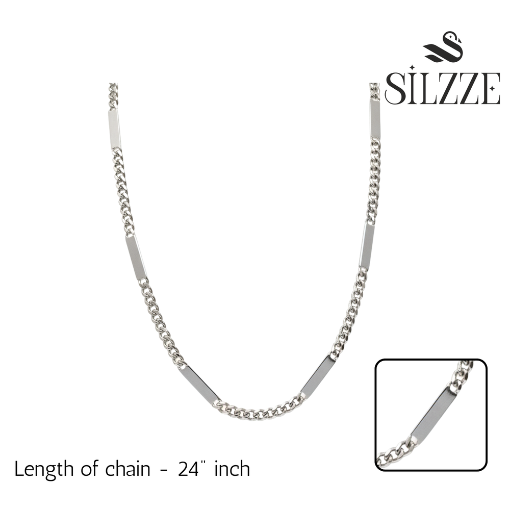 This hybrid design alternates between smooth, geometric bar links and fine curb (or cable) chain segments, offering a sharp, modern, and high-fashion aesthetic. Perfect for those who seek a distinctive look. Worn alone, it delivers a powerful, avant-garde statement. Its distinct design makes it a stand-out piece, minimizing the need for additional pendants or layering