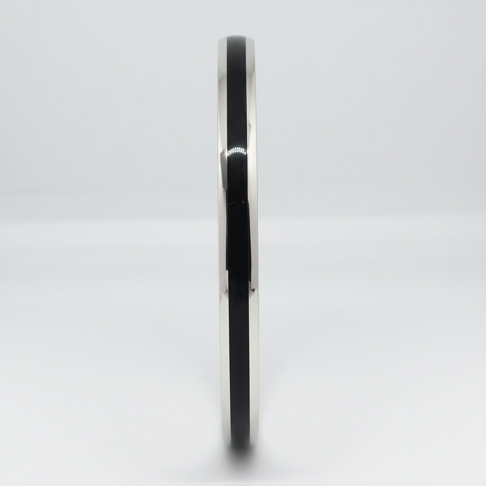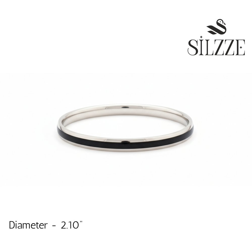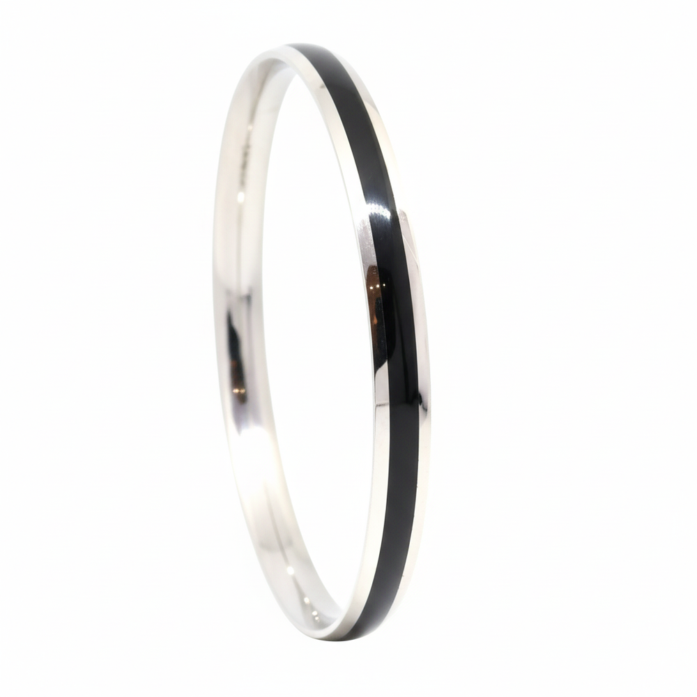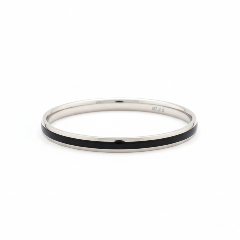 This 925 Sterling silver Kada features a smooth, substantial profile designed for comfortable and impactful daily wear. The highly polished silver creates a mirror effect, perfectly framing the bold, opaque black stripe. This classic monochrome pairing provides a clean, sophisticated, and versatile look that transitions effortlessly from the office to evening events.