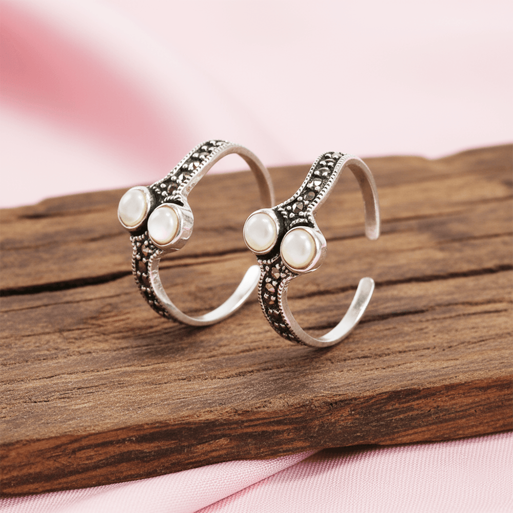 This silver mother of pearl (MOP) toe ring with marcasite design with two mop embedded in between and with marcasite it is giving vintage aesthetics to the toe ring which makes it unique, Different , Antique and stylish
