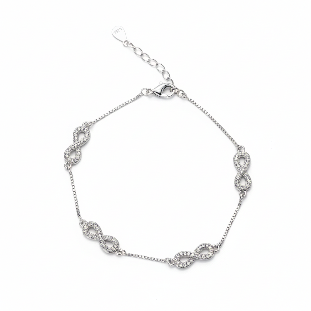 Showcasing the eternal promise of the infinity symbol, our Dazzling 925 Silver Multiple Infinity Link Bracelet is designed for lasting beauty. This captivating bracelet features four interconnected infinity symbols, each brilliant with paved cubic zirconia stones. The bright silver finish provides a crisp, luxurious sparkle that complements any outfit, from casual wear to formal attire. It sits gracefully on the wrist, offering a sophisticated glimmer that draws the eye and makes a meaningful gift.